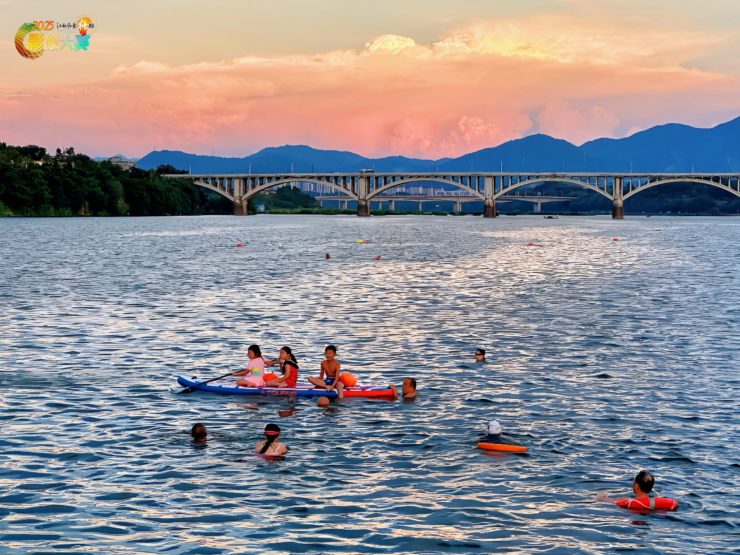 2025年8月28日拍摄于建春门古浮桥。在落日余晖的笼罩下,建春门贡江之上,色彩鲜艳的桨板上坐着三个天真烂漫的小孩,他们或专注划桨,或惬意欣赏周围景色。 几位大人在水中守护,确保孩子们的安全。远处,桥梁横跨江面,连绵的山峦与绚烂的云霞相映成趣,整个画面洋溢着温馨、悠闲的氛围,记录下孩子们无忧无虑的美好瞬间。