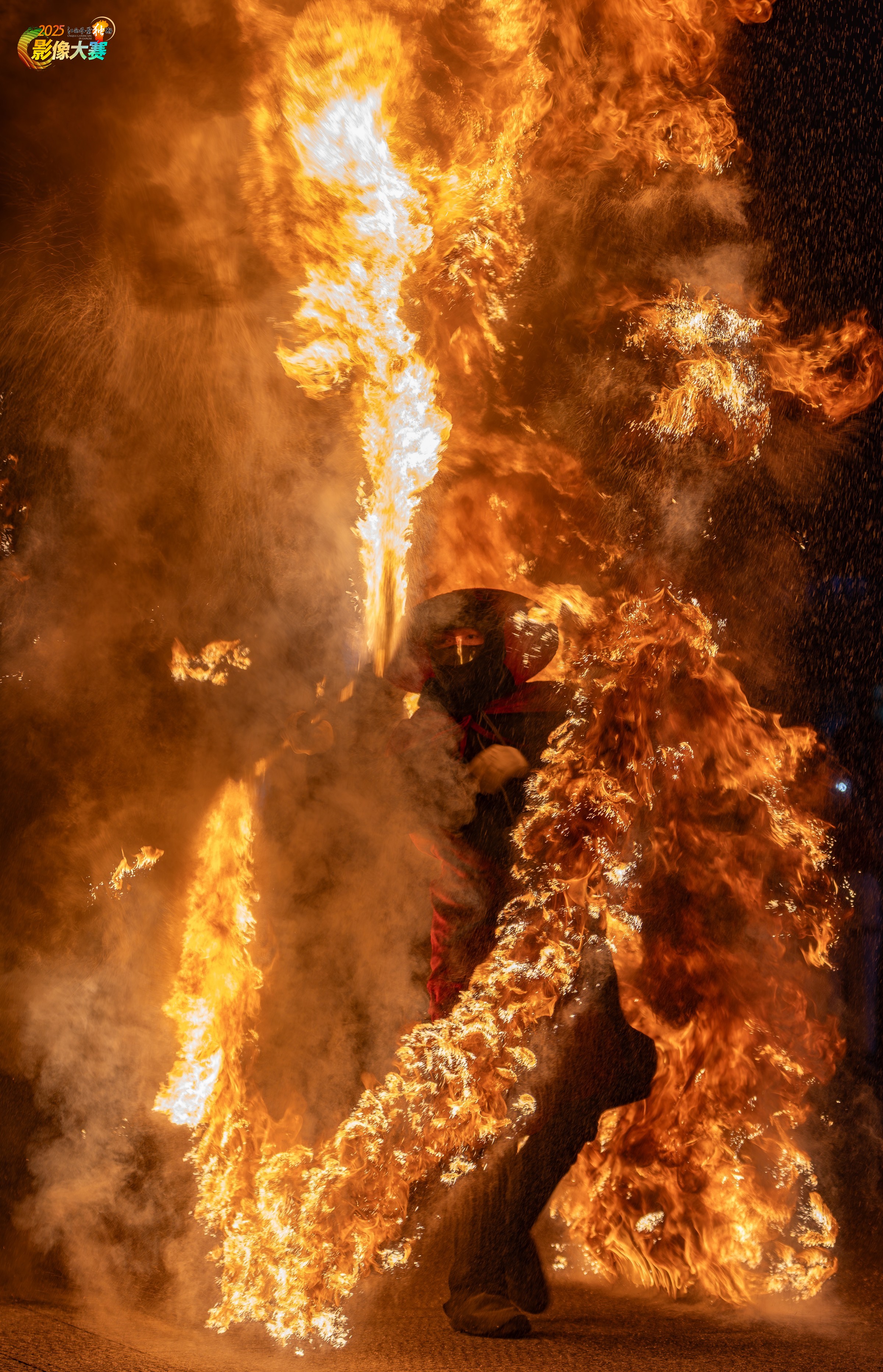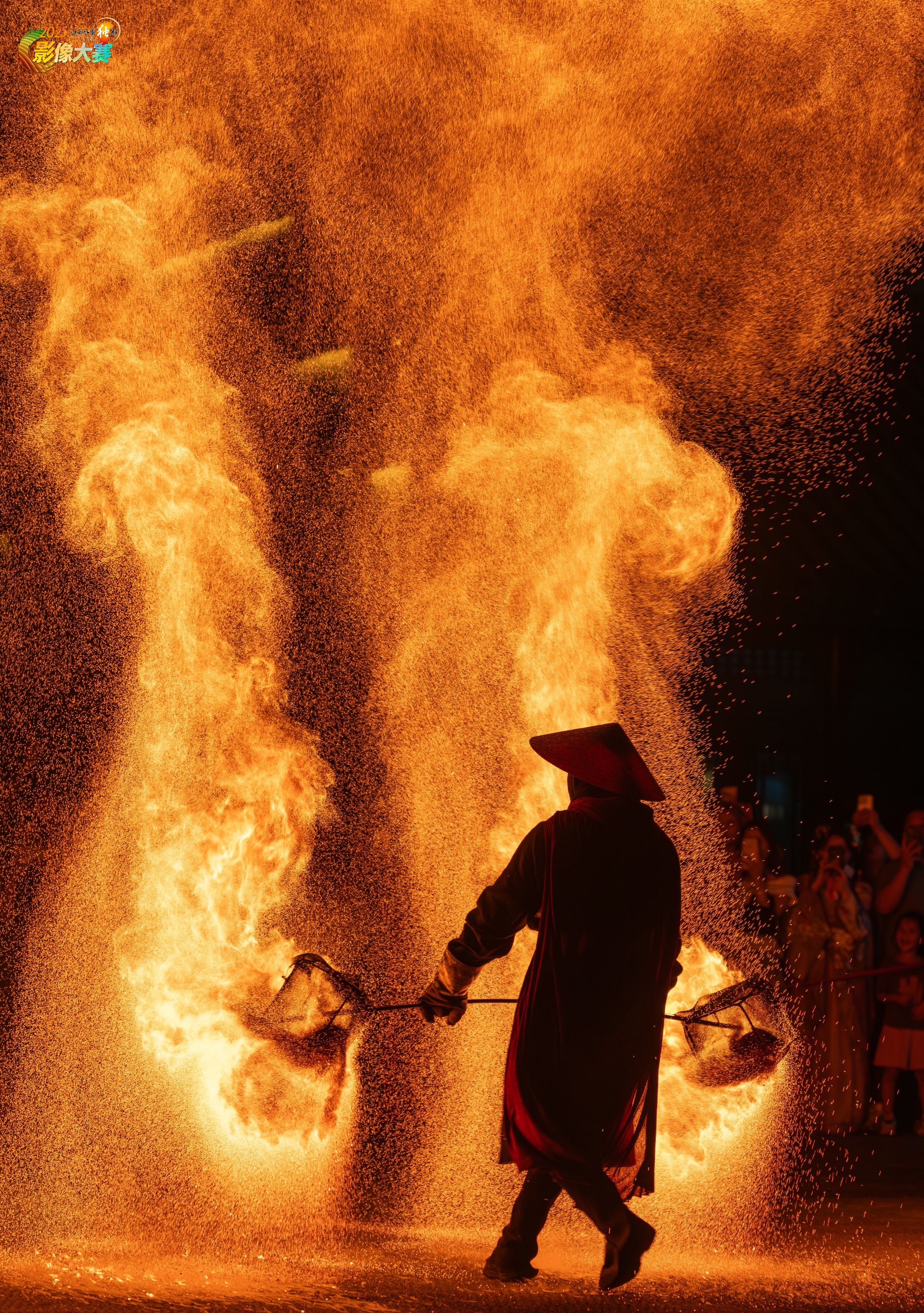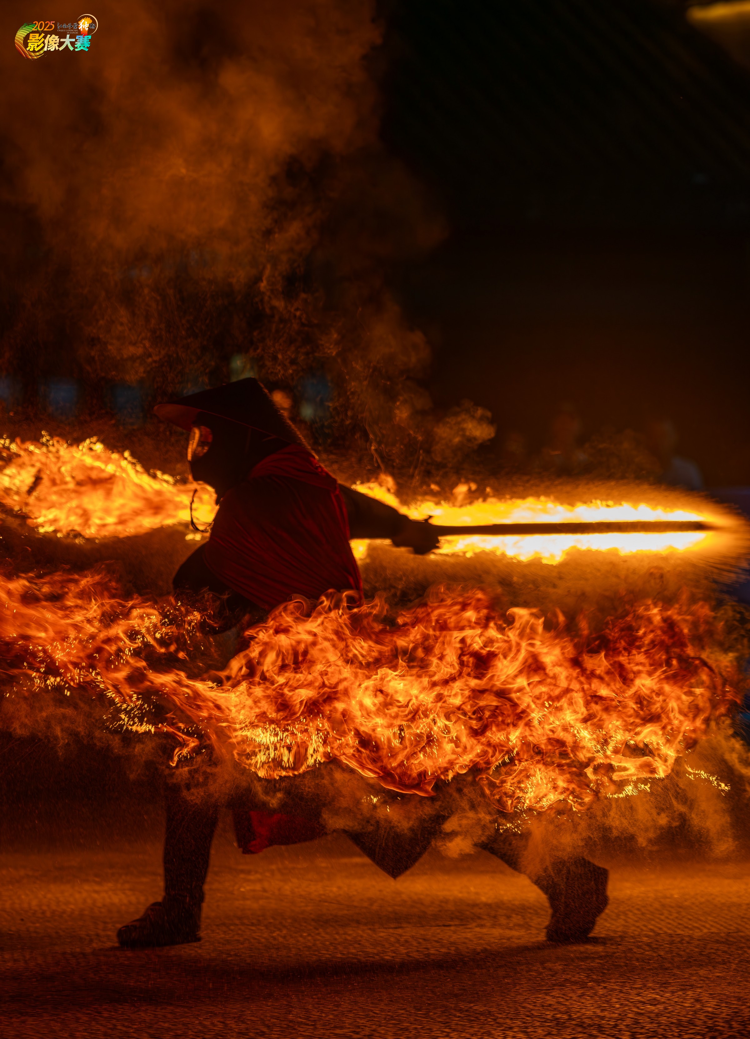 表演者身披红袍、头戴斗笠,在熊熊烈焰中如侠客般穿梭。火焰如狂涛般翻涌,将其身影裹挟其中,烟雾缭绕间更显神秘不羁。作品以浓烈的橙红火光为核心,在暗夜的衬托下,把传统武侠的侠义意象与现代火舞特技的震撼力相融,捕捉到火舞表演中力量与动感的瞬间,仿佛一场武侠世界的火焰对决在此上演,让观者在火焰的炽热中感受到突破常规的艺术震撼。