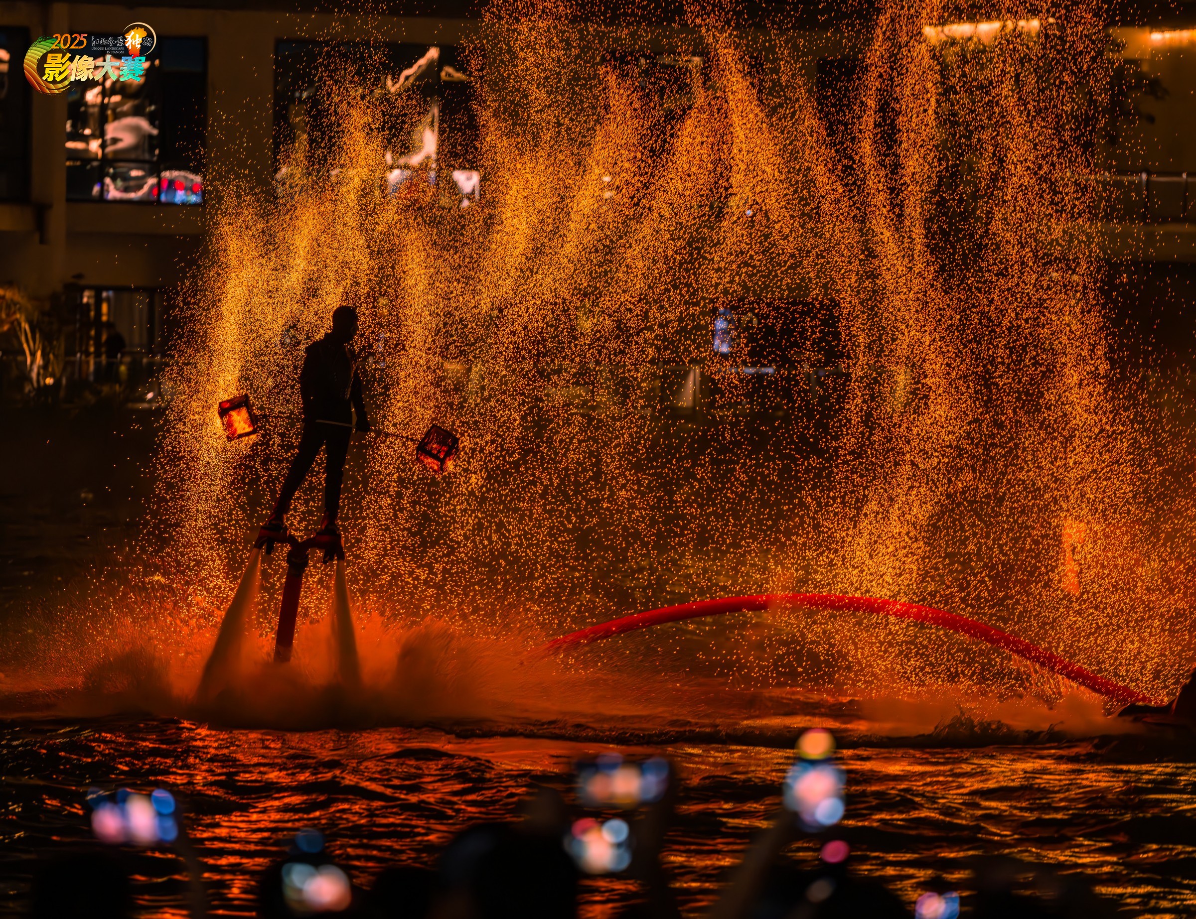婺女洲水上火壶表演挥洒出的金红火花在夜色中连绵成火墙形成背景,如哪吒闹火海般震撼,前景观众举着手机记录的姿态,既凸显表演的吸睛度,又构建出 “现代特技 - 神话意象 - 大众观赏” 的趣味联结。作品以火墙的视觉冲击呼应神话场景,用动静交织的画面,展现极限运动的张力与烟火艺术的奇幻,同时捕捉都市夜娱的活力,让现代表演艺术与传统神话想象产生奇妙碰撞,传递出对新奇体验与视觉震撼的双重追求。