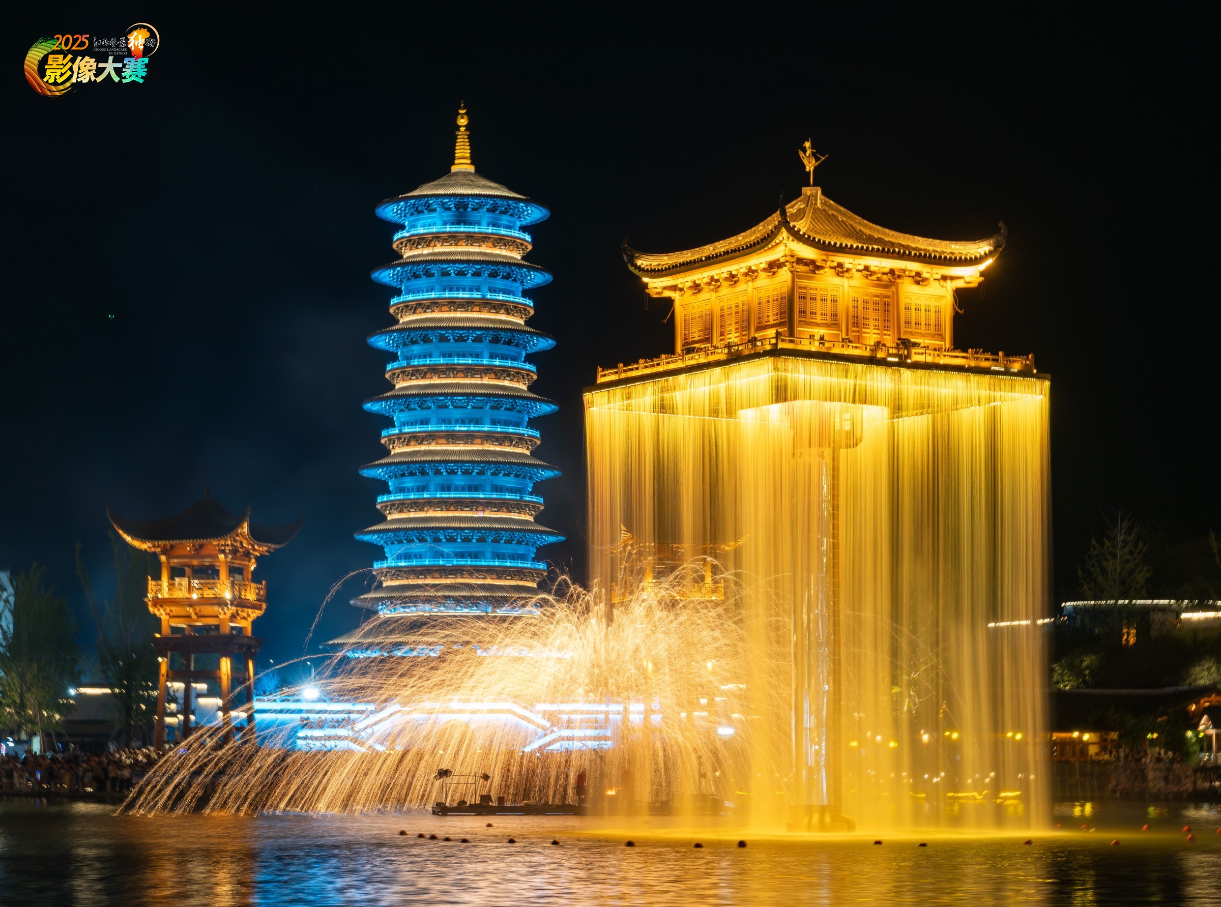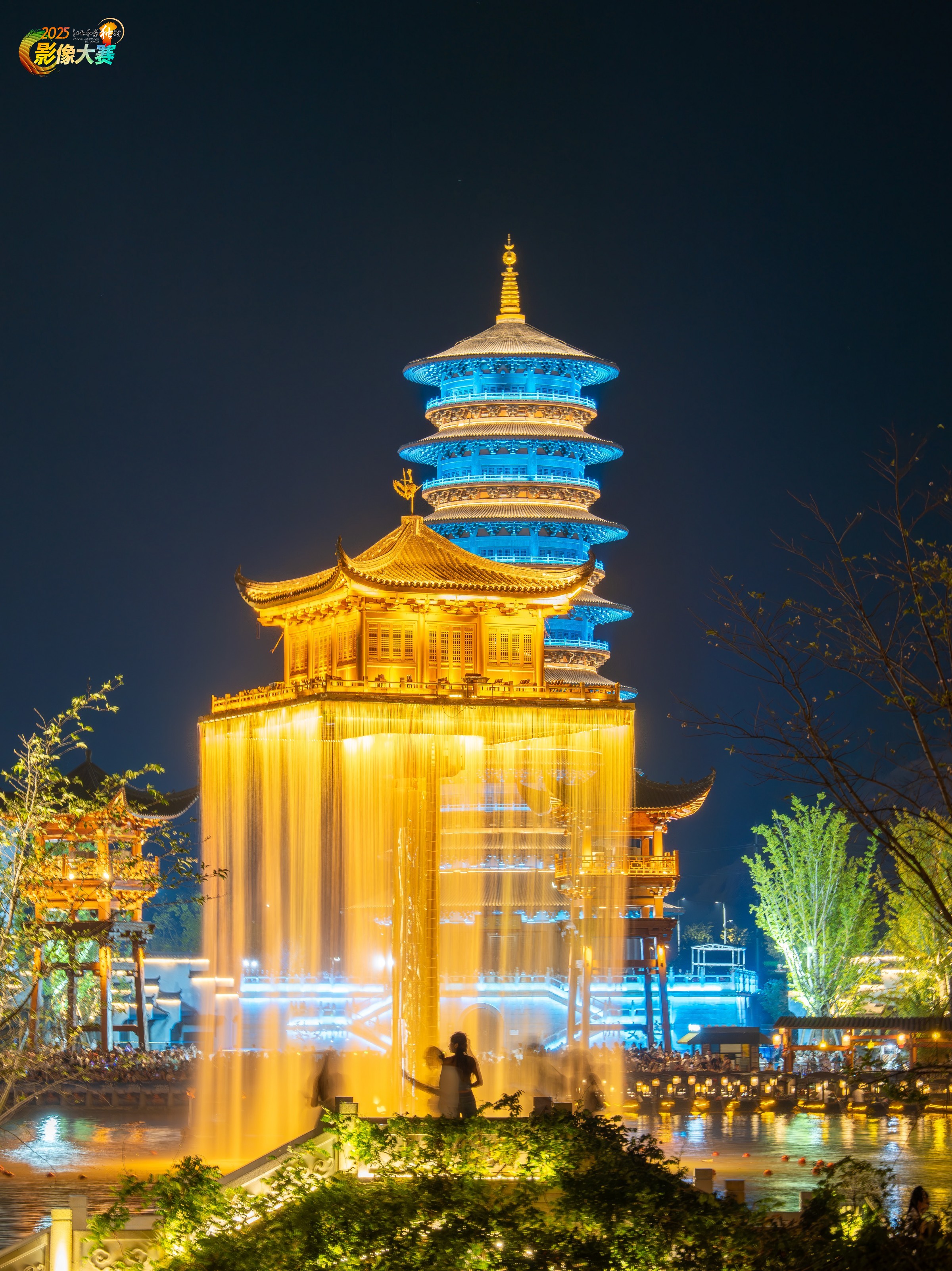 作品聚焦江西婺女洲度假区的夜间盛景,以抱玉塔的蓝调流光、金阁的水幕灯帘与非遗打铁花的璀璨金芒为核心,在暗夜中构建出如苏轼词中 “天上宫阙” 的奇幻图景。蓝塔的层叠韵律、金阁的水幕垂落与铁花的星雨迸溅交相辉映,传统楼阁建筑与现代光影、非遗技艺融合,水面倒影将绚烂景致加倍铺展,既展现了婺女洲对 “一生痴绝处” 的诗意诠释,又通过古今艺术的碰撞,传递出文旅地标在夜间经济与文化传承中的独特魅力。
