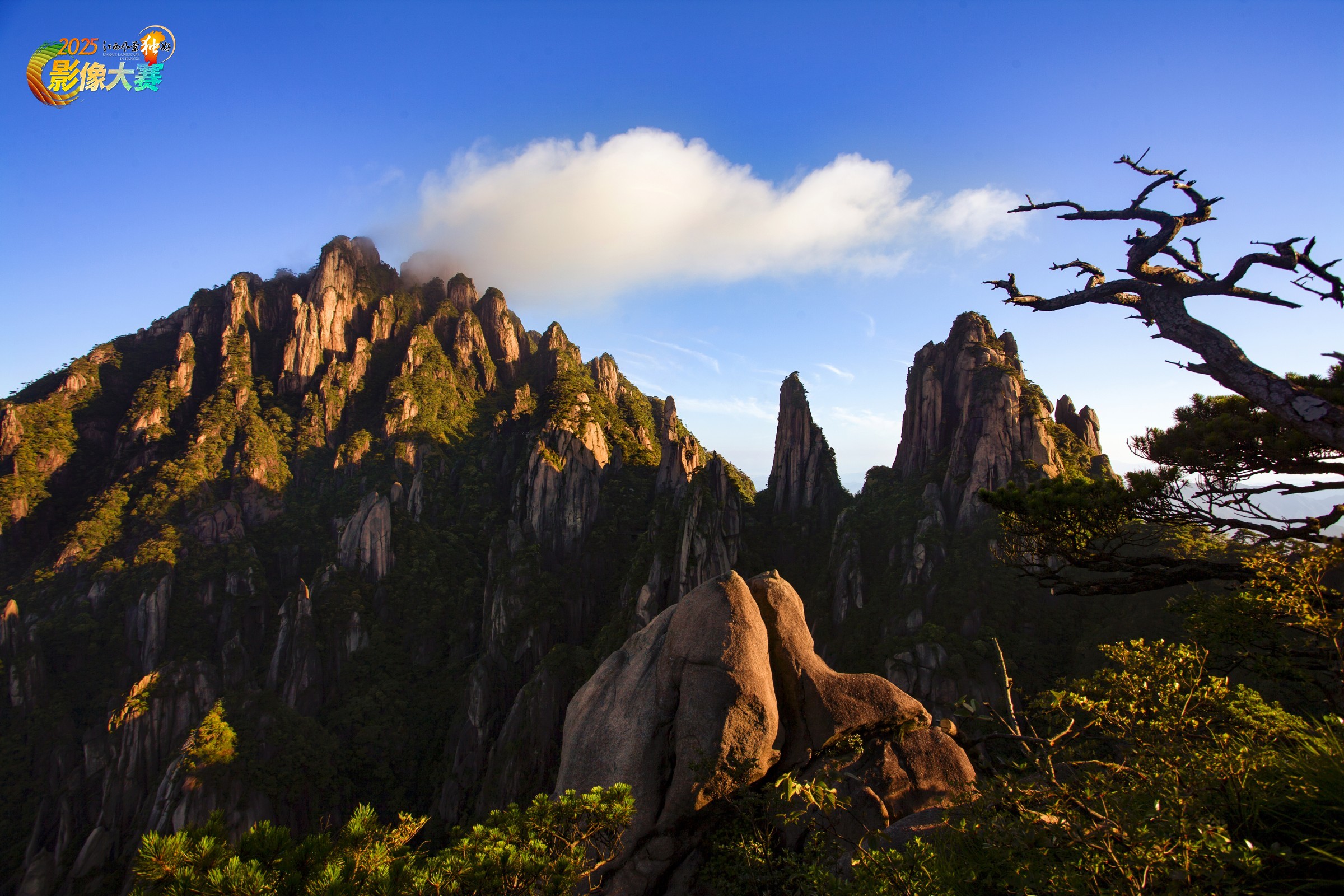 晨光照在主峰的峰林上,前景的双乳峰在主峰的阴影前格外亮眼,枯死的松树在画面中顽强耸立。