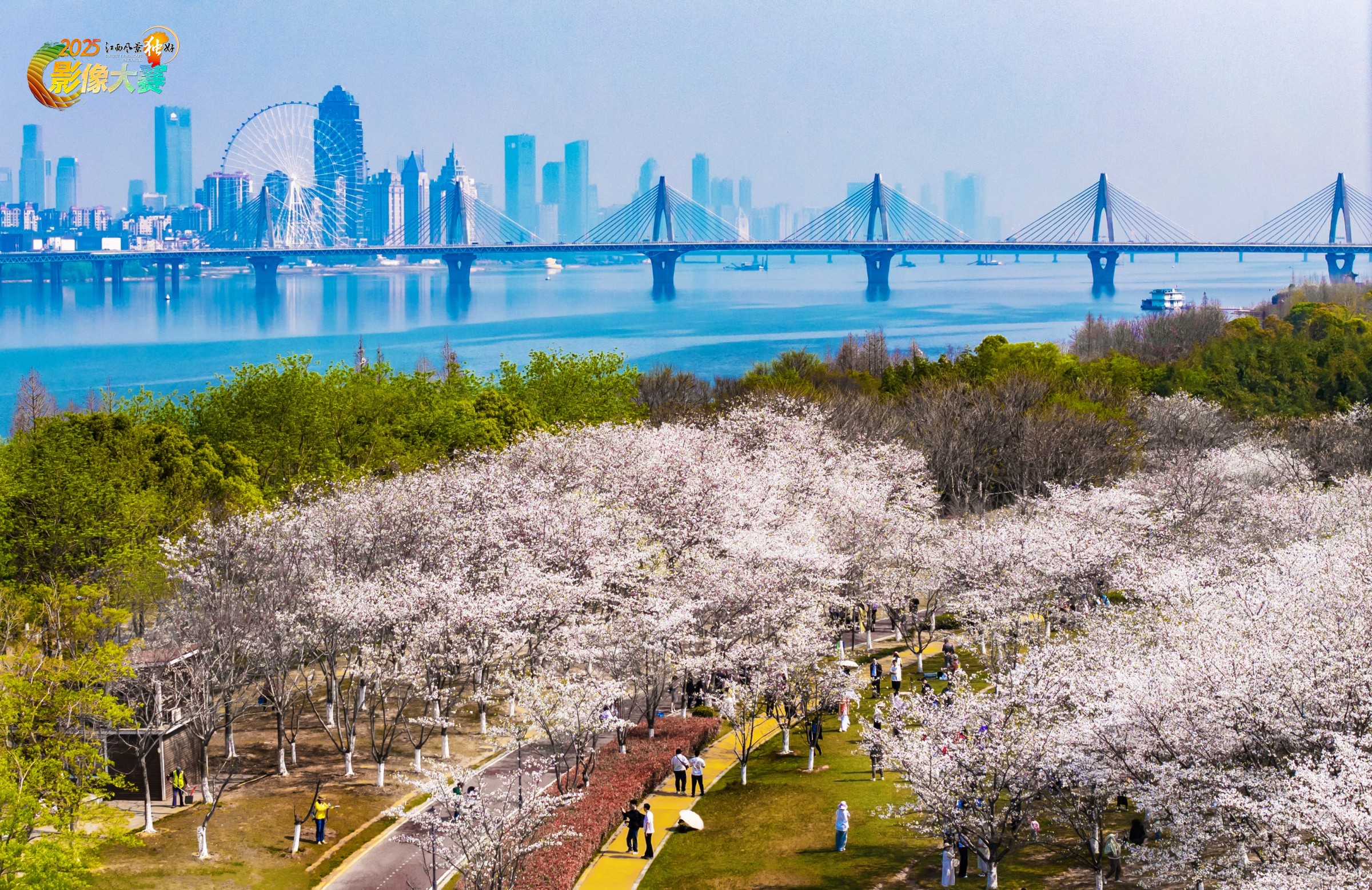 四月的南昌,江滩公园的樱花盛开,与近处的赣江、远处的朝阳大桥、红谷滩新区融为一体,宛若云霞。市民们穿梭其中,尽情享受美好的春光。