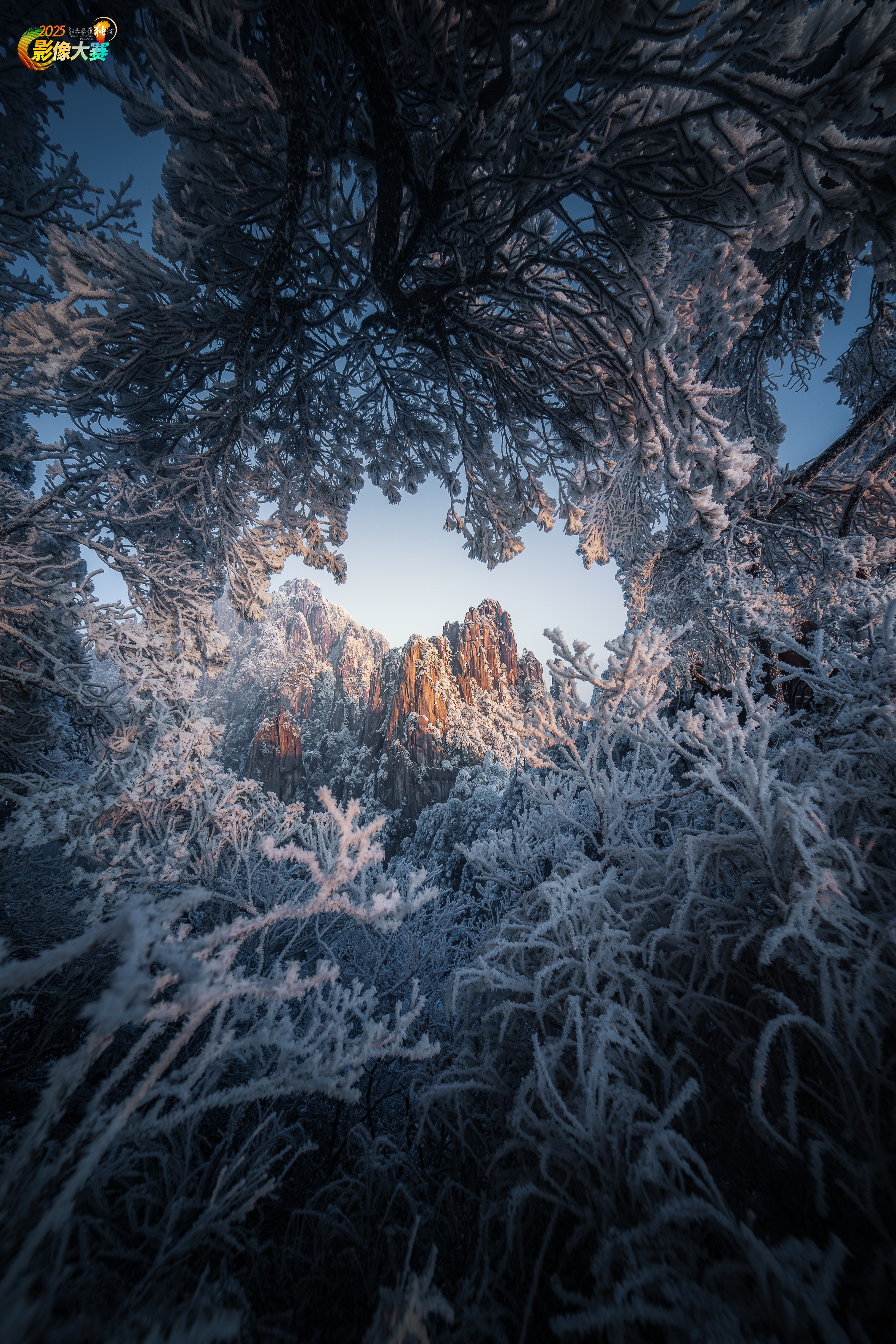 拍摄于下雪过后日出的三清山,近处的松枝挂满白雪,正好框住了远处的山峰。我按下快门,定格这一瞬。
