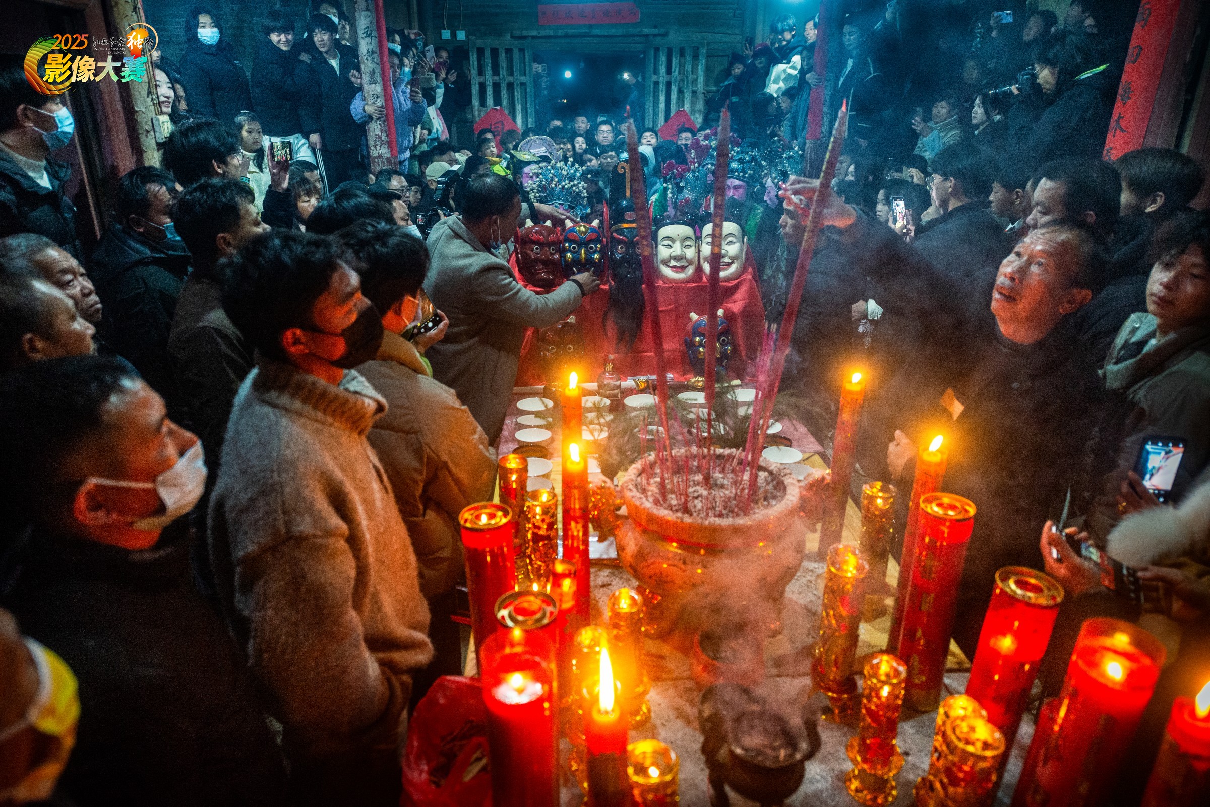 正月初十凌晨,田东村圆傩活动渐入尾声。傩神庙内烛火摇曳,香烟缭绕,村民们虔诚祭拜,将心中祈愿寄于神灵,祈盼新岁平安吉祥、万事顺遂。2025年2月7日拍摄于江西省抚州市南丰县白舍镇田东村。