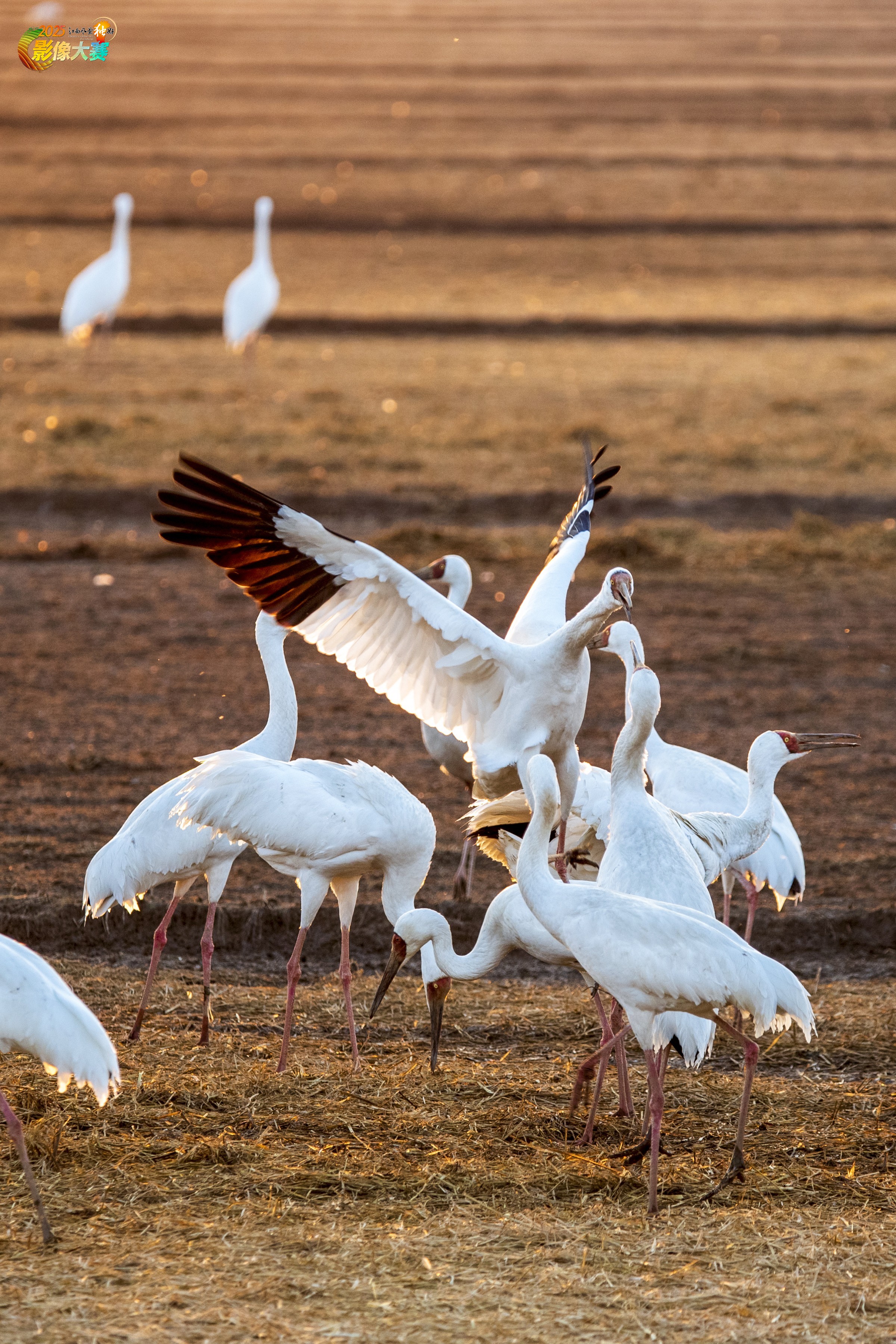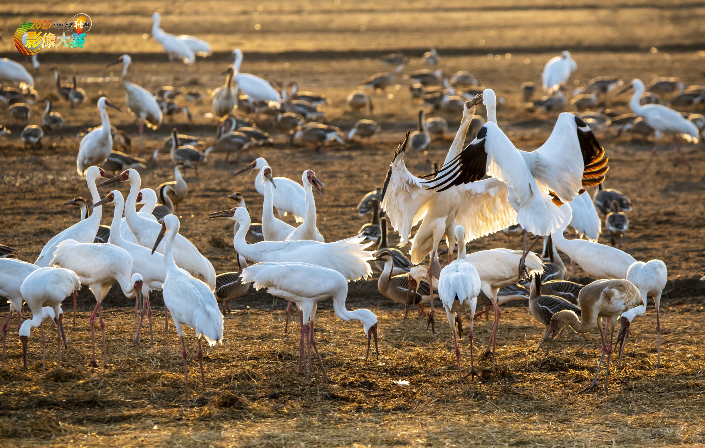 冬春季节江西鄱阳湖平原,是大雁白鹤等候鸟温馨的家园。图为一群白鹤在稻田中为争食谷粒而打闹,鹤舞田园。摄于余干县插旗农场2025.2月.