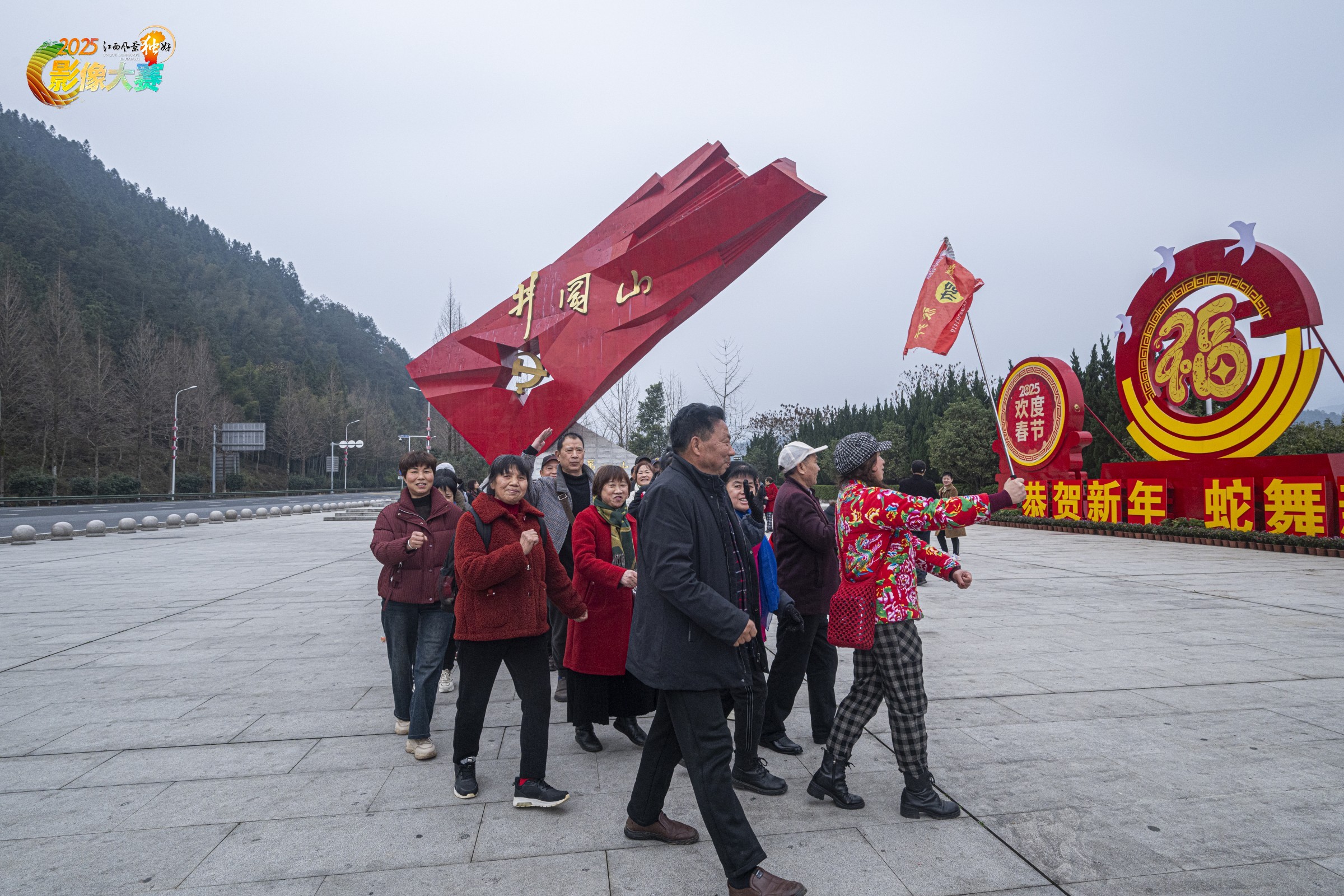 这是一群来自湖南的旅游,来到井冈山感到非常豪迈,自发的列队围绕红旗广场,唱起红歌。