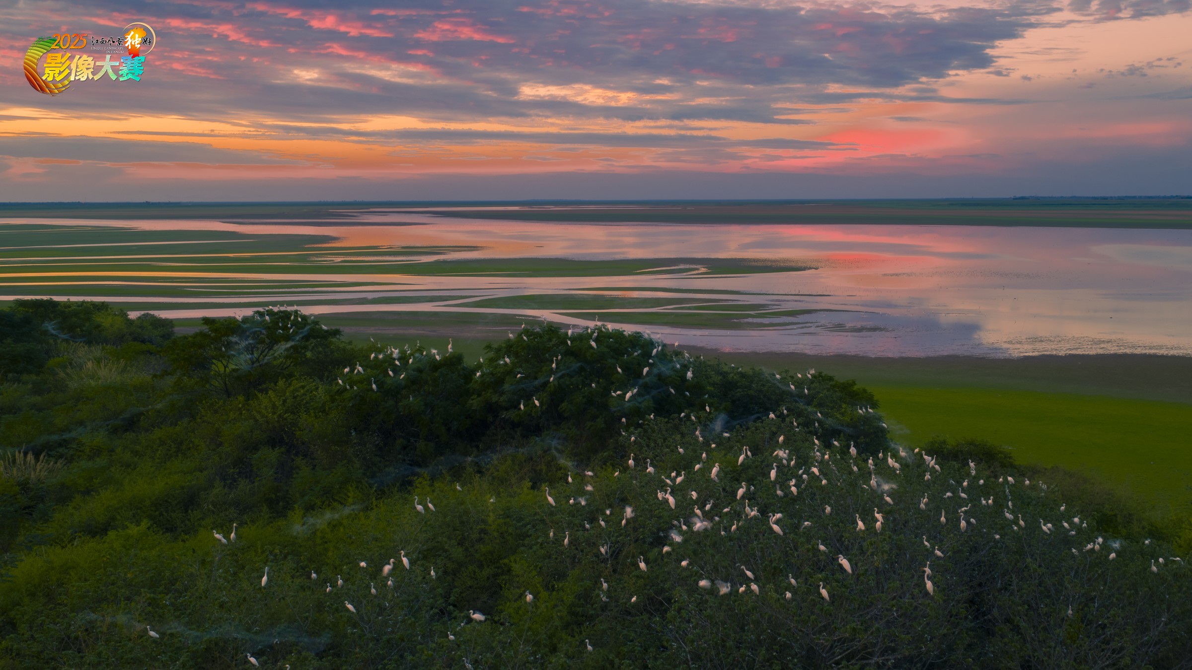 金溪湖是鄱阳湖的一个湖汊。夕阳西下,天边一抹红霞,湖中五彩斑斕,还有归巢的鸟儿,好一幅和谐美妙的天然画卷。