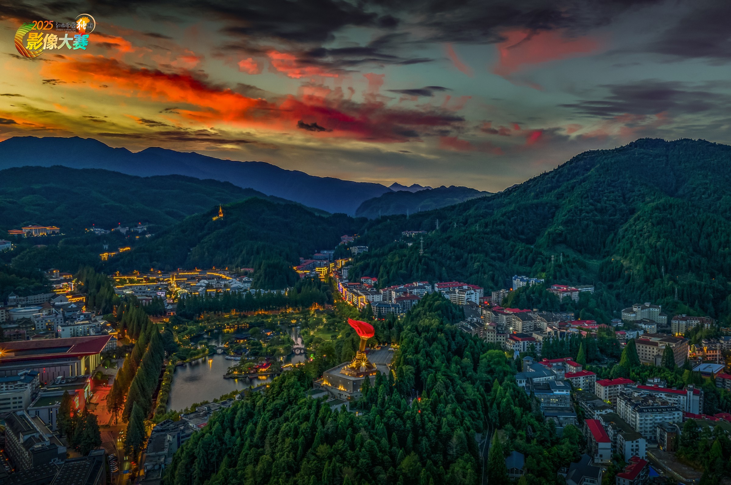 2024年7月15日,航拍于井冈山茨坪镇挹翠湖岸边。日落时分,晚霞映照整个南山公园的火炬广场及挹翠湖,与灯火辉煌的山城相响应。突出了火炬这个主体。成为一道璀璨夜景风景线。
