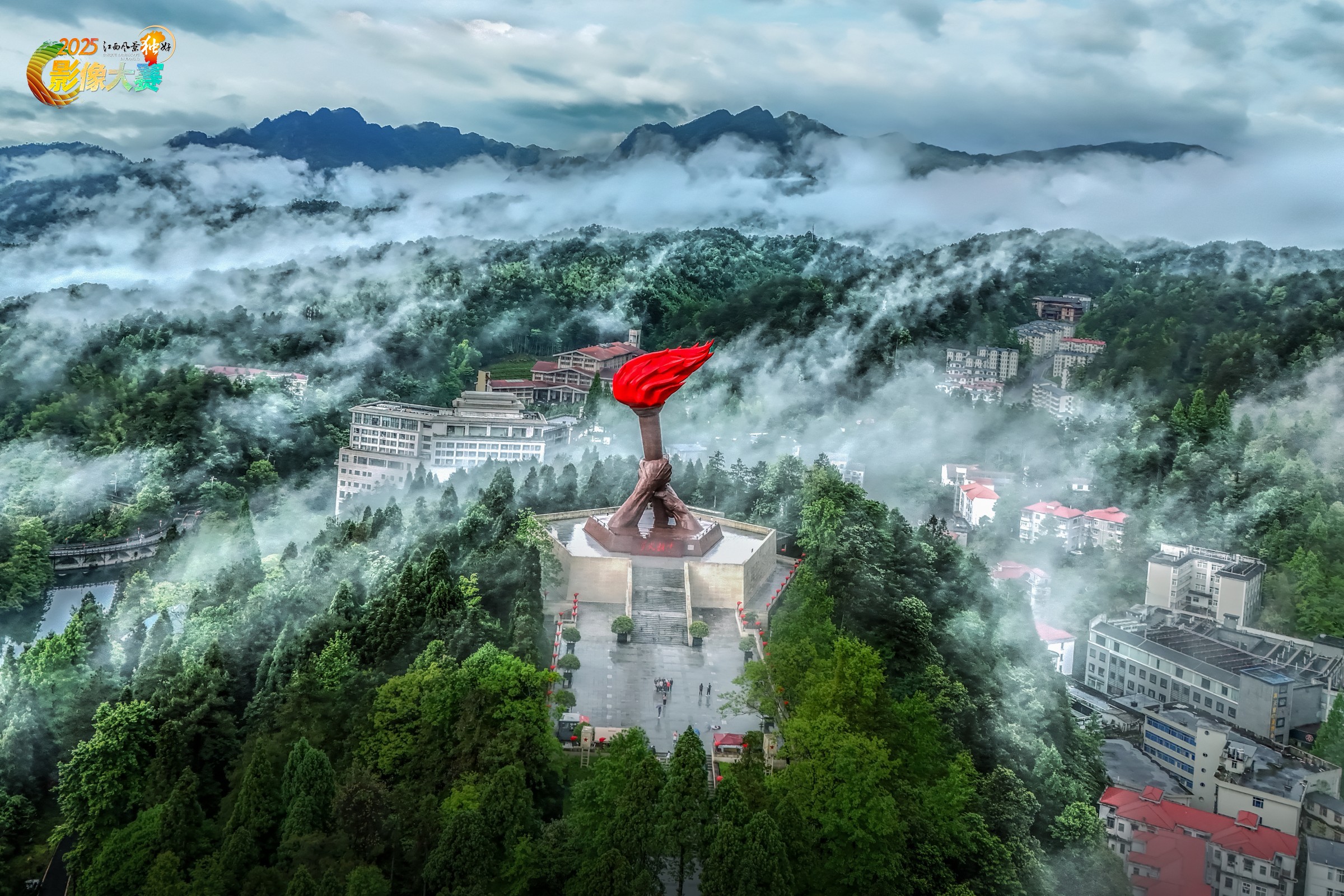 2024年5月4日,航拍于井冈山茨坪镇挹翠湖岸边。火炬广场的火炬,在云海中显得格外耀眼。