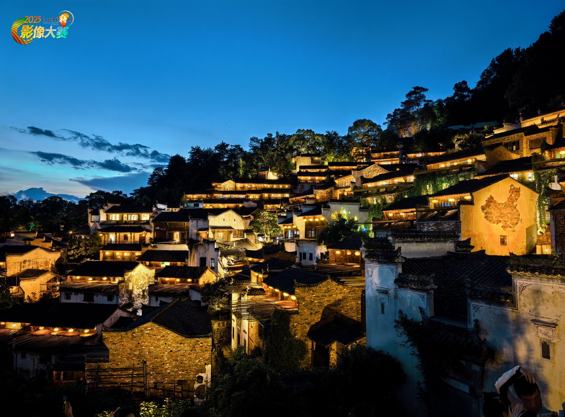 暮霭为篁岭披上幽蓝纱衣,黛瓦白墙与层叠梯田浸染清冷色调。晒秋圆匾盛满斑斓丰收,云雾缭绕山间,如静谧水墨画卷,诉说着时光流淌的诗意与宁静。