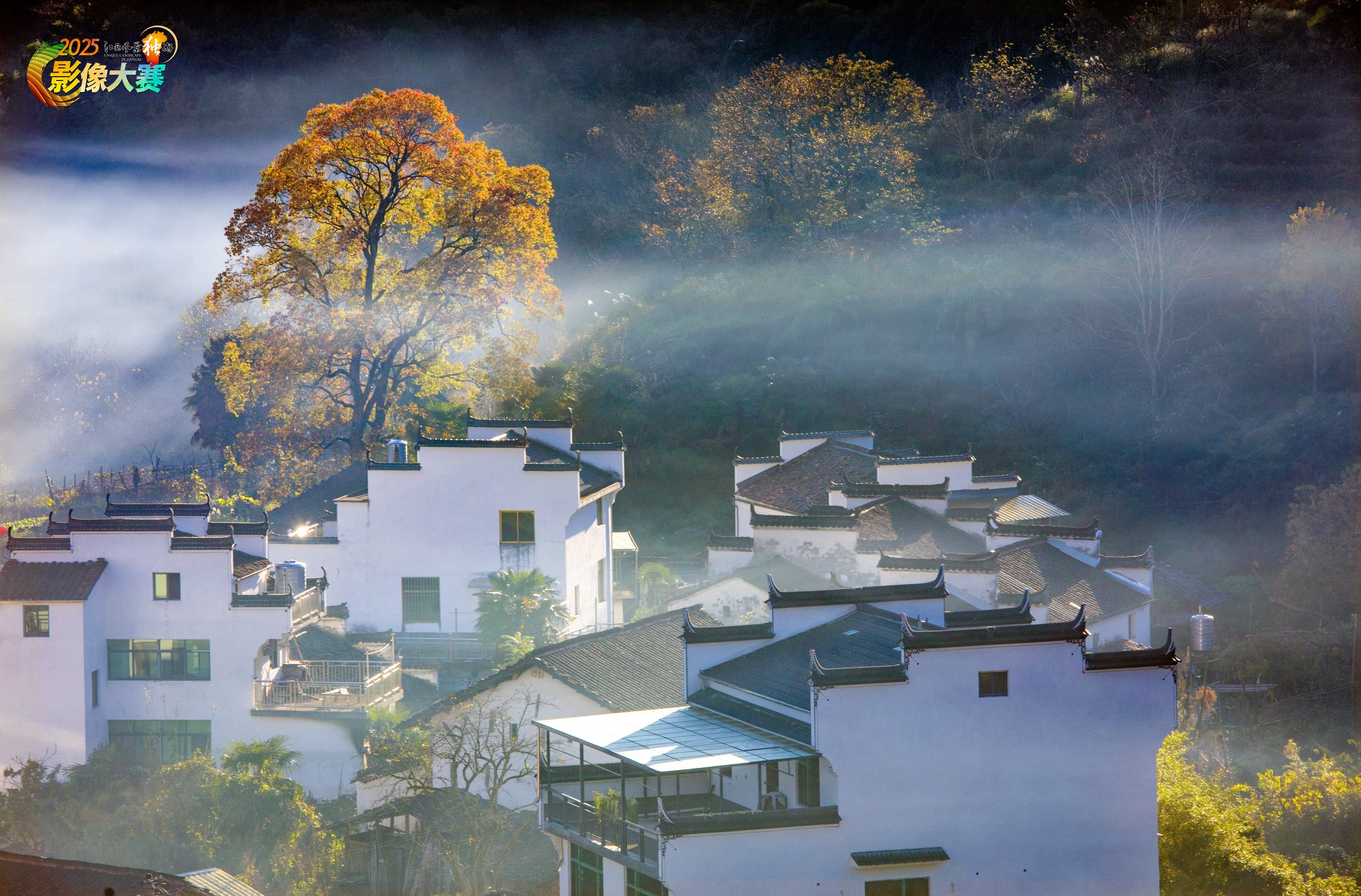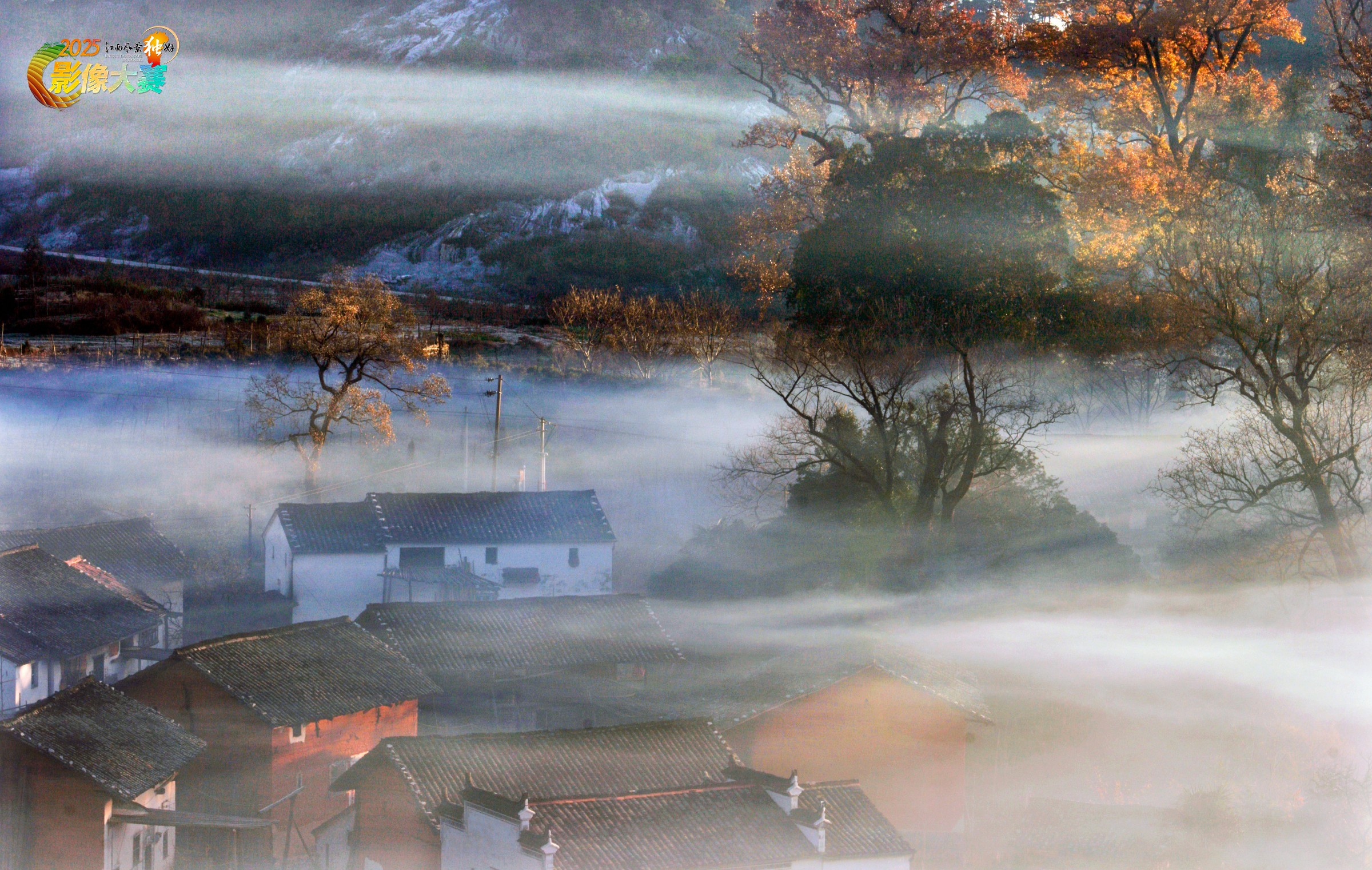 晨雾中的山村,白墙黑瓦,犹如在画中。