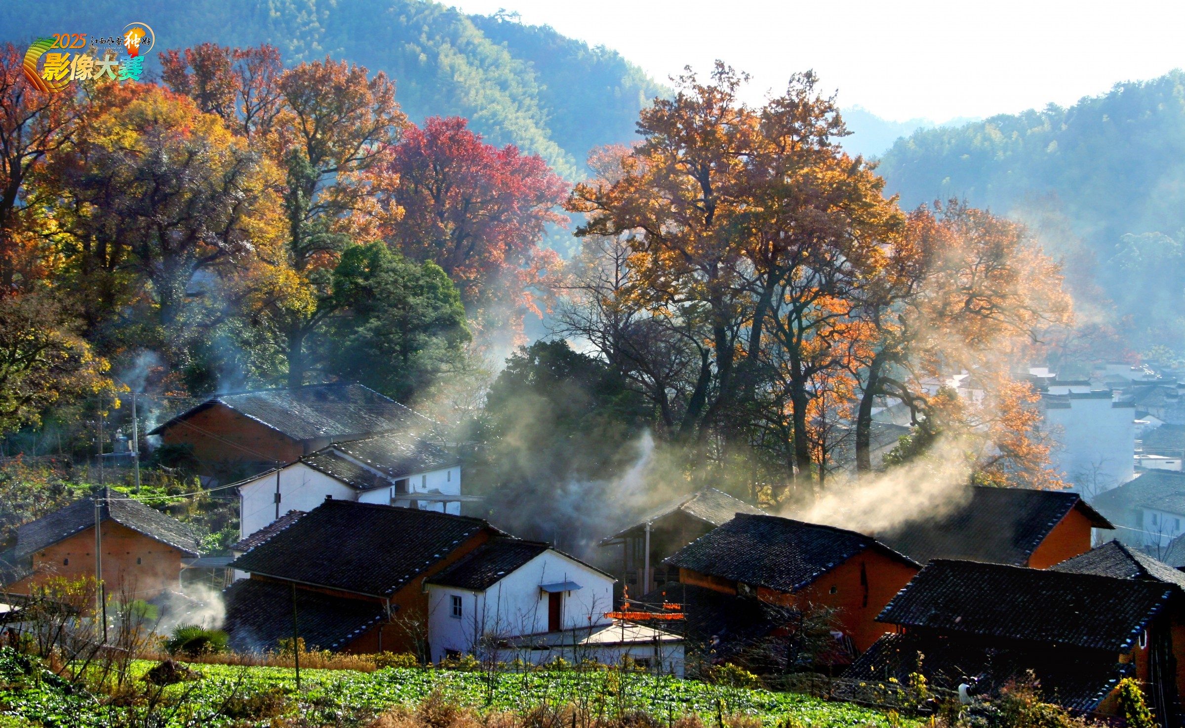 红枫下的袅袅炊烟、民居在晨光中展现出和谐家园的秋日场景。