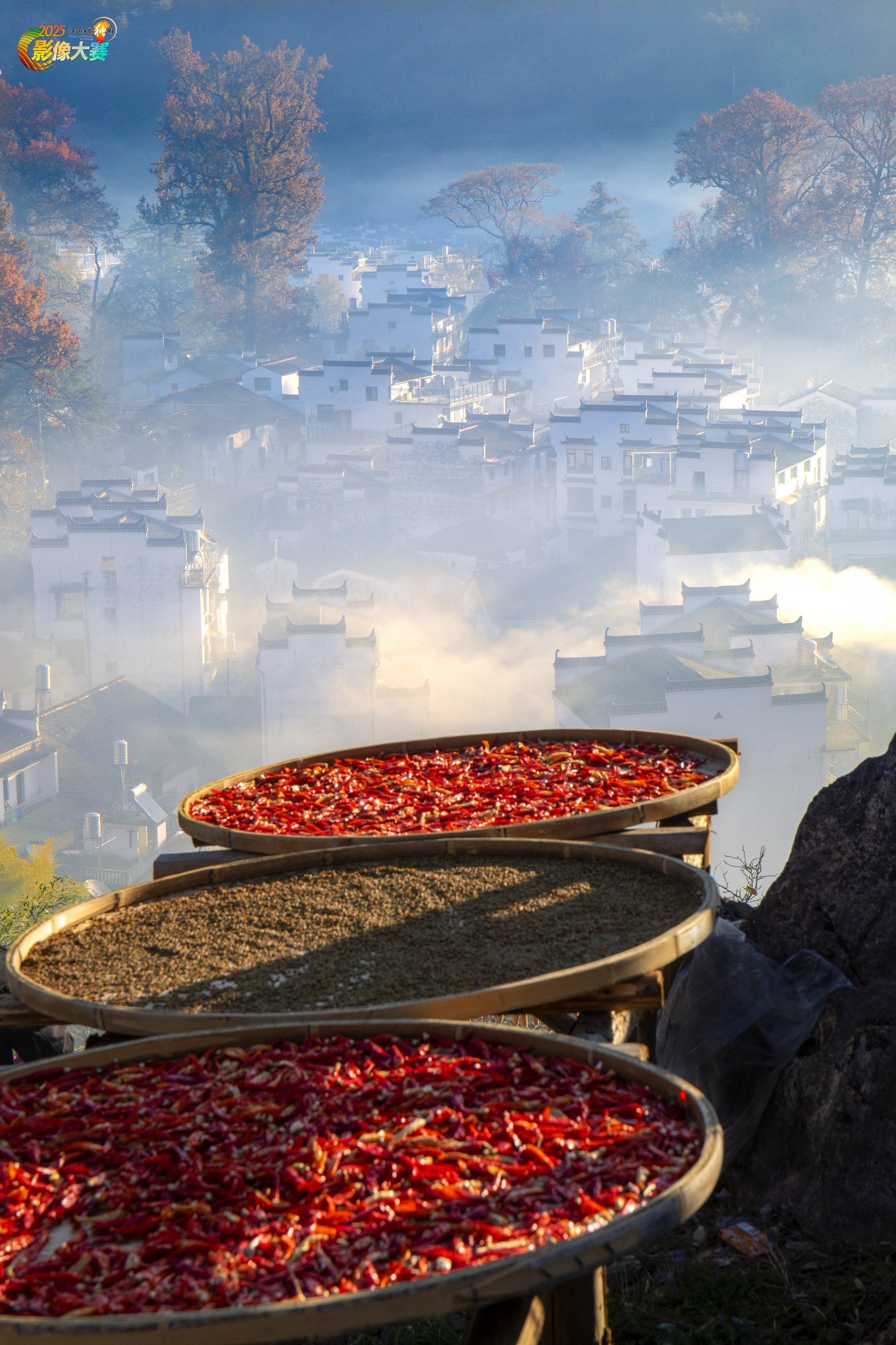 将晒秋的农作物做前景,拍摄晨雾中的村庄红枫,浓浓的秋日秋色,