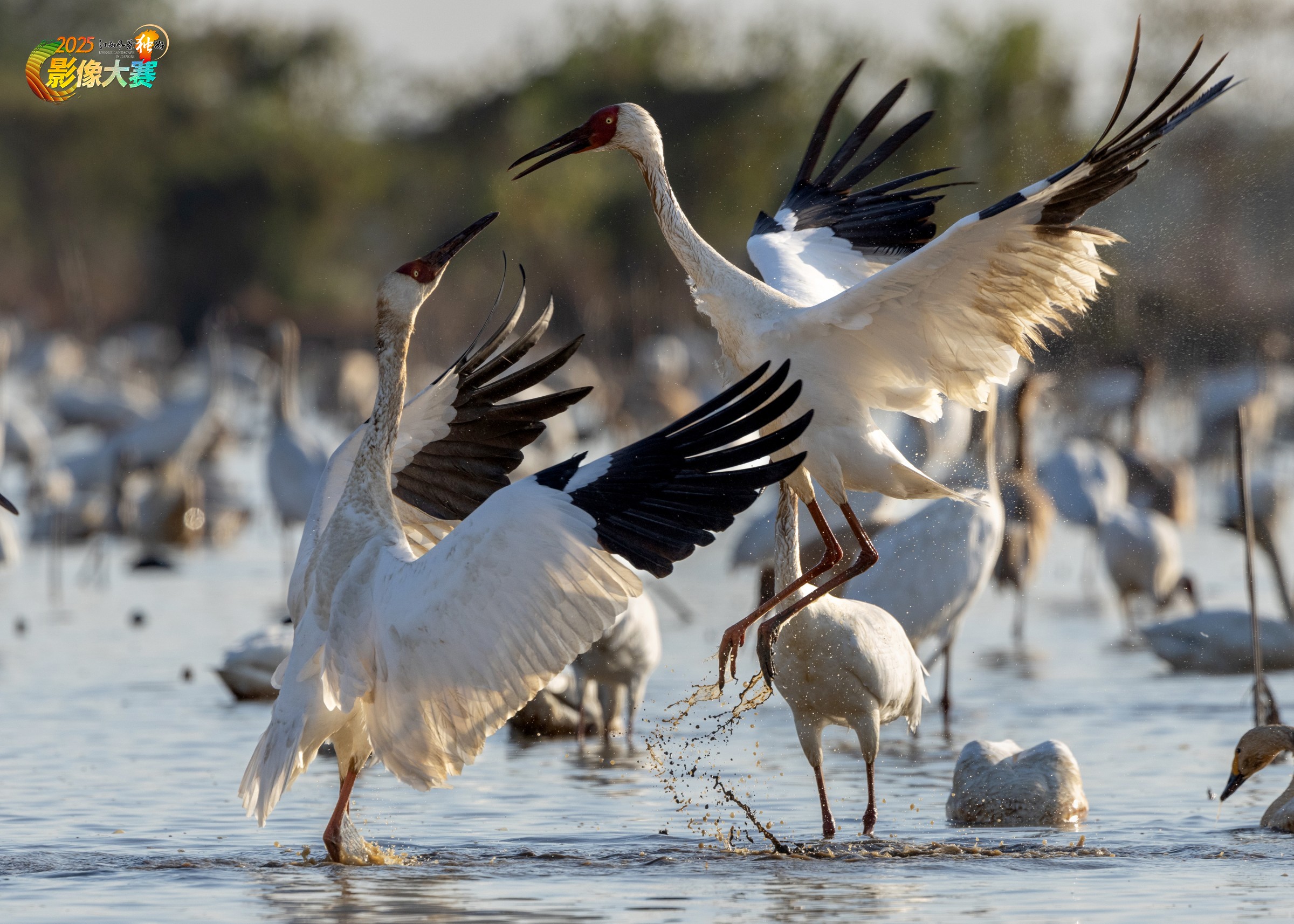 全球90%以上的白鹤在鄱阳湖越冬,它们在湿地里栖息、嬉戏。