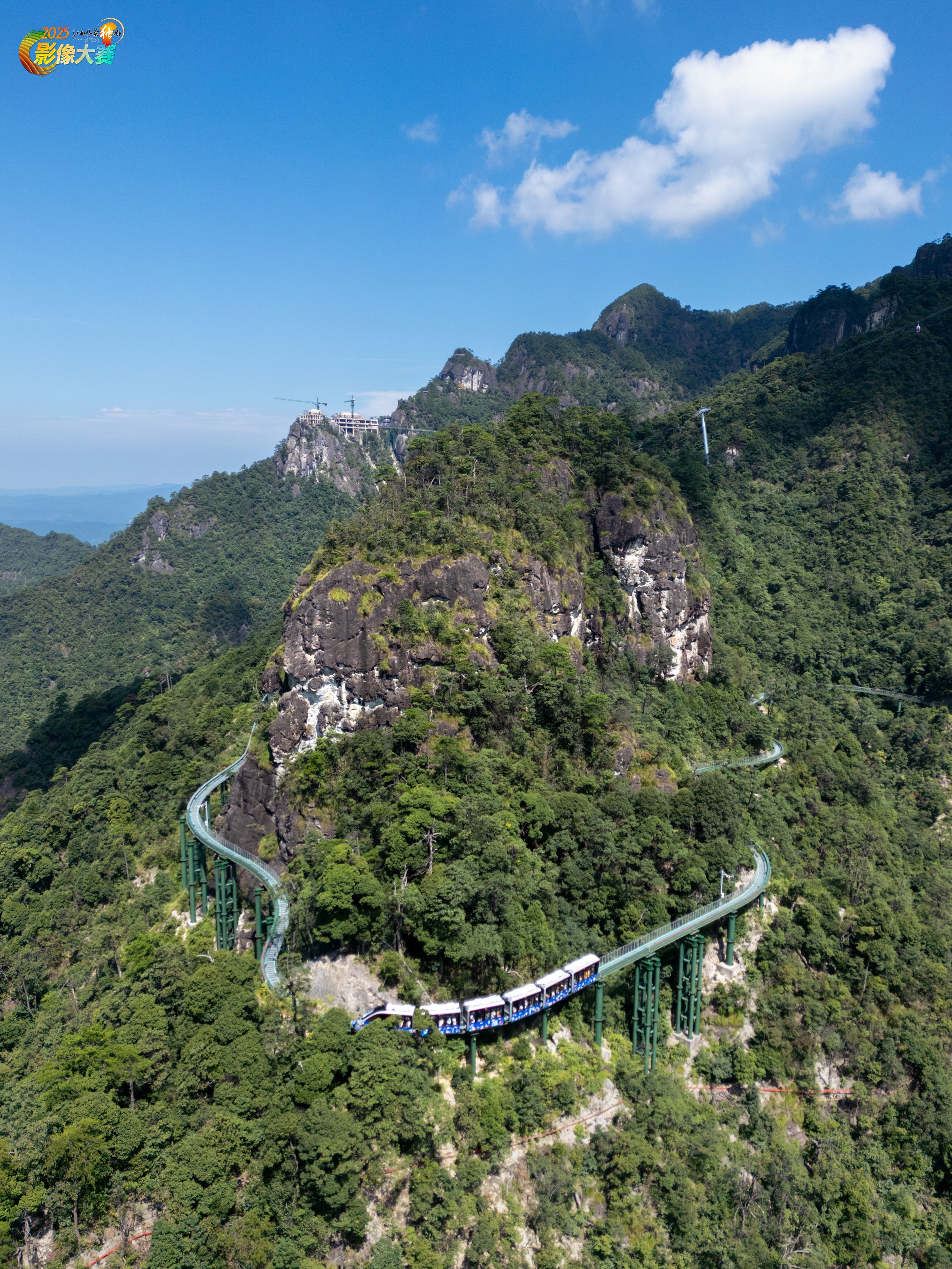 大觉山景区的“悬崖动车”全长11.8公里,紧贴悬崖,在山谷间穿行。
