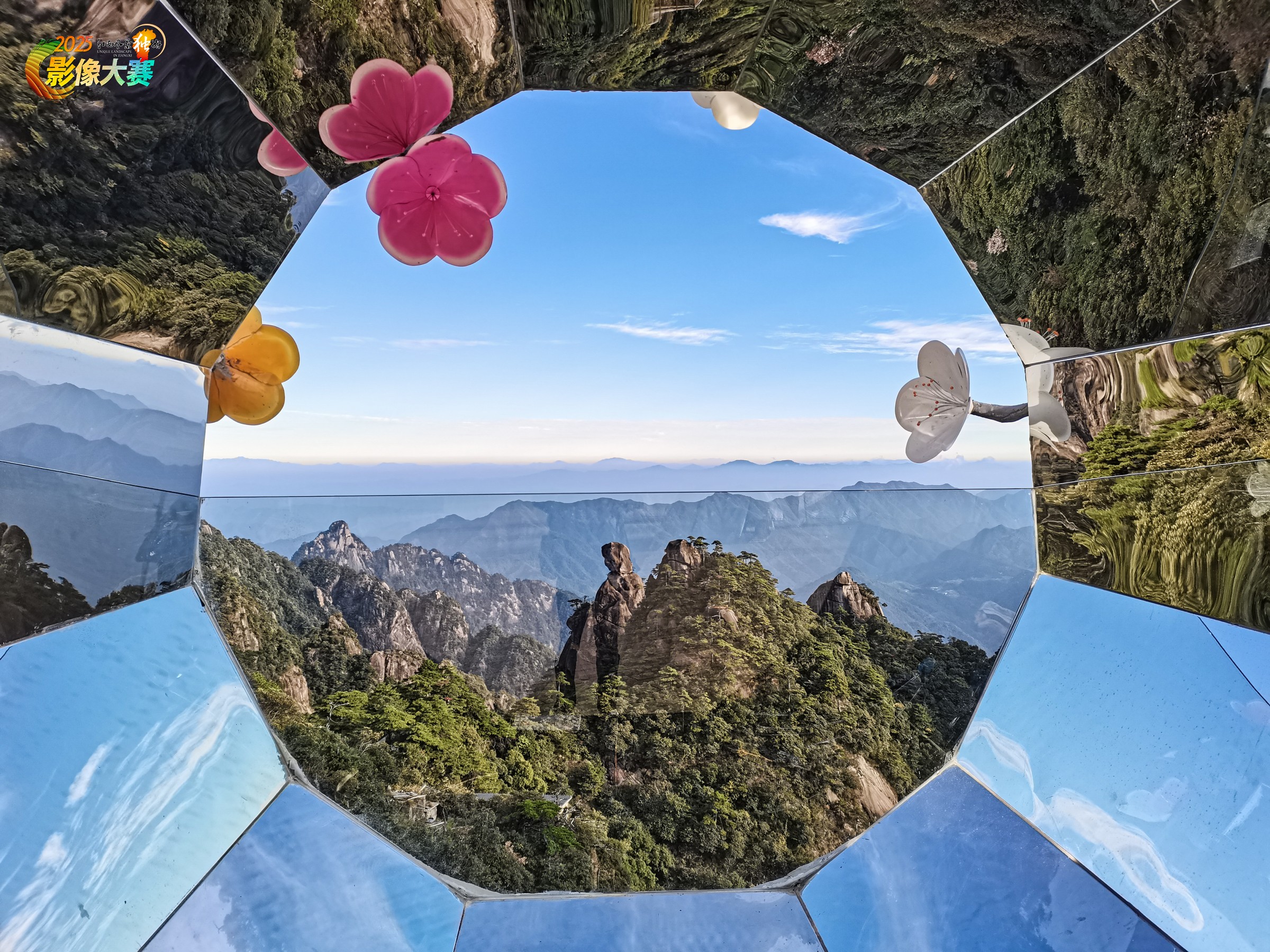 三清山玉女峰附近的一个镜面装置,仿佛万花筒一般,将三清山变幻成魔镜中的世界。 2022.10.19摄于江西省上饶市玉山县