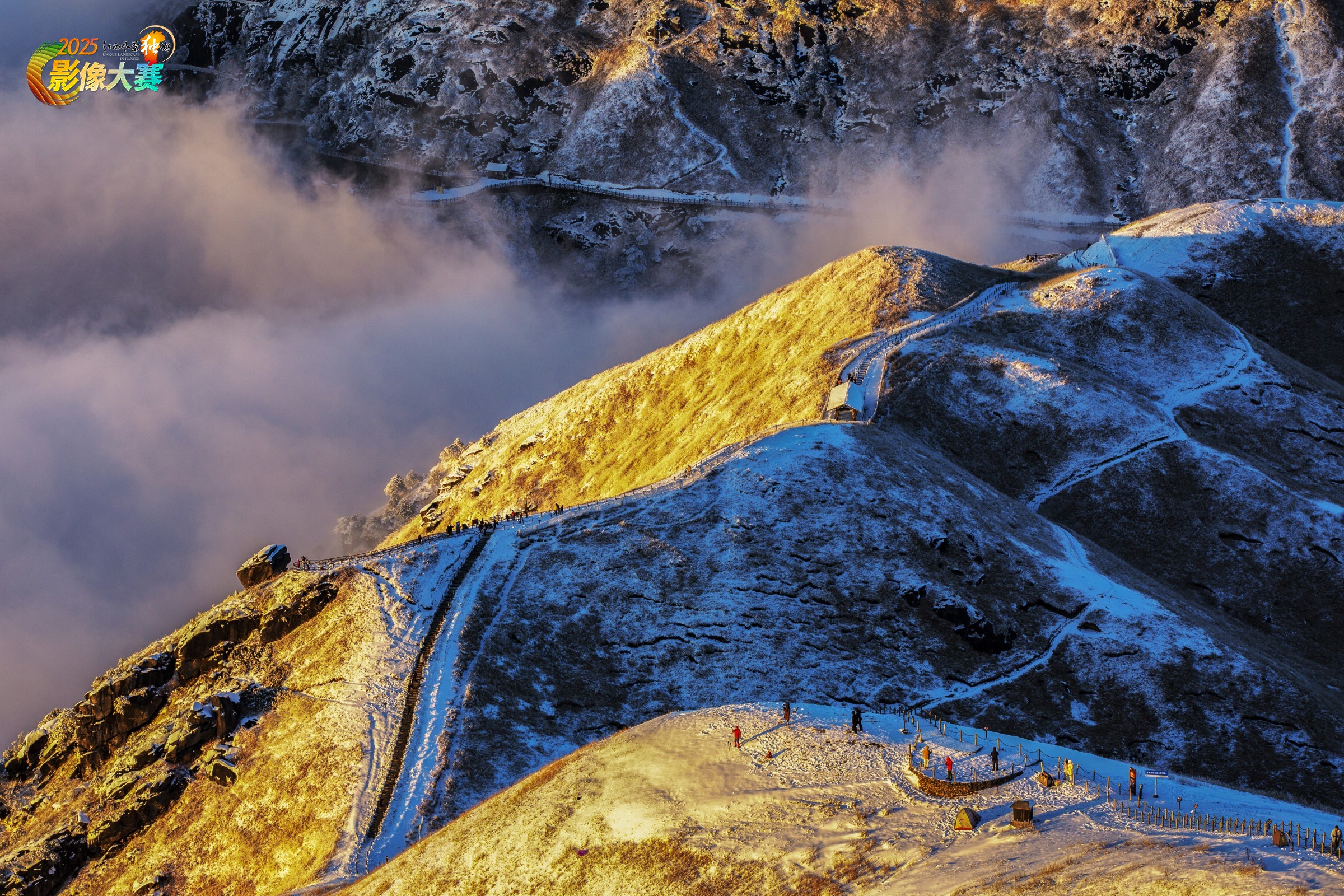 雪后的武功山游步道,在夕阳照射下焕发出金色光芒,宛如鎏金天路,美不胜收。
