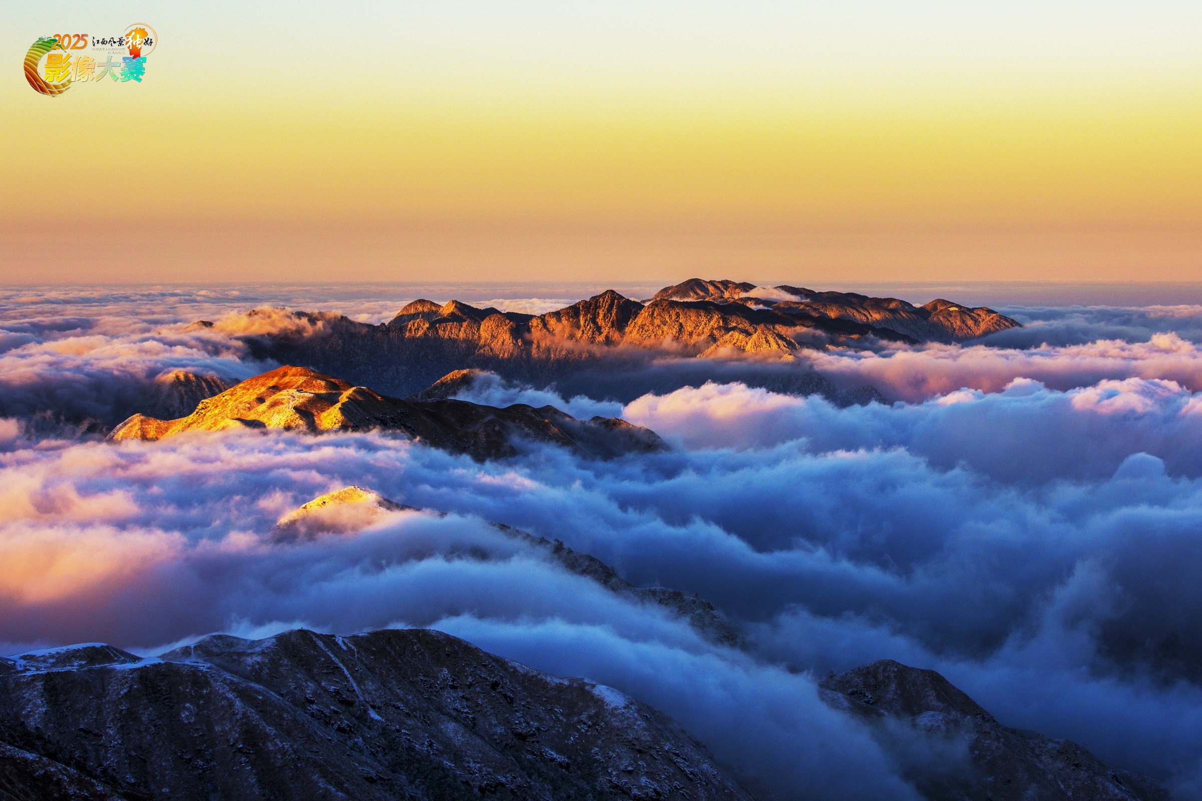 雪后武功山,云海绕山间,夕照鎏金光。