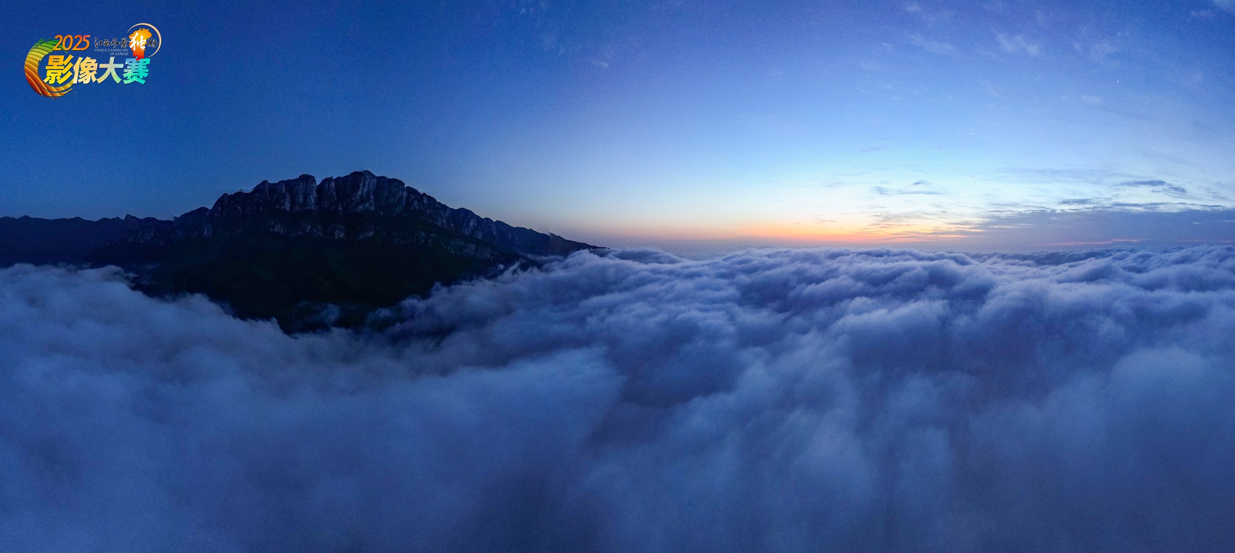 这张早晨拍摄的庐山五老峰照片,呈现出壮丽而宁静的云海日出景象。画面左侧的五老峰轮廓清晰,山体在晨光中形成深色剪影,宛如五位老者静坐云端。浩瀚的云海占据大部分视野,层次分明,近处云朵柔软,远处逐渐融入天光,营造出梦幻般的氛围。天空由深蓝渐变为地平线处的淡橙和粉紫,光线柔和且富有层次,形成冷暖对比。整体氛围空灵静谧,既有自然的雄奇,也带有东方山水画的意境,让人感受到清晨的宁静与壮美,仿佛置身于天地之间,心旷神怡。
