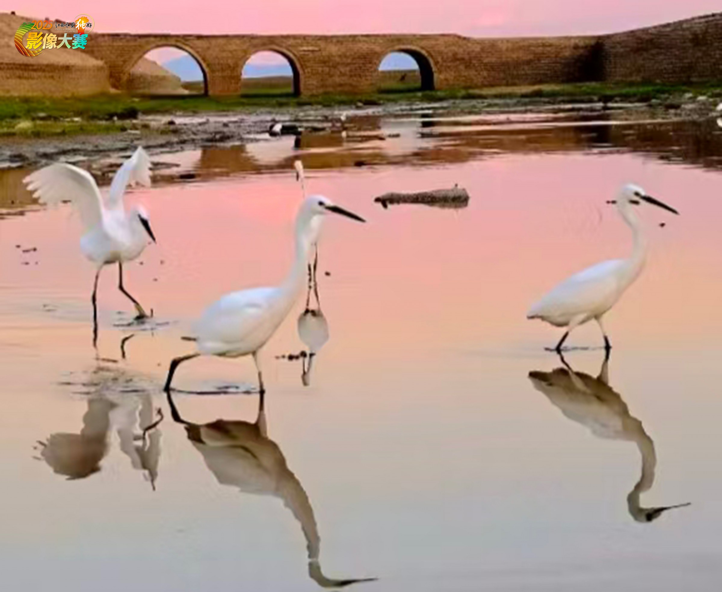 鄱湖晨曲:鹭鸶戏水,古桥映霞绘生态。