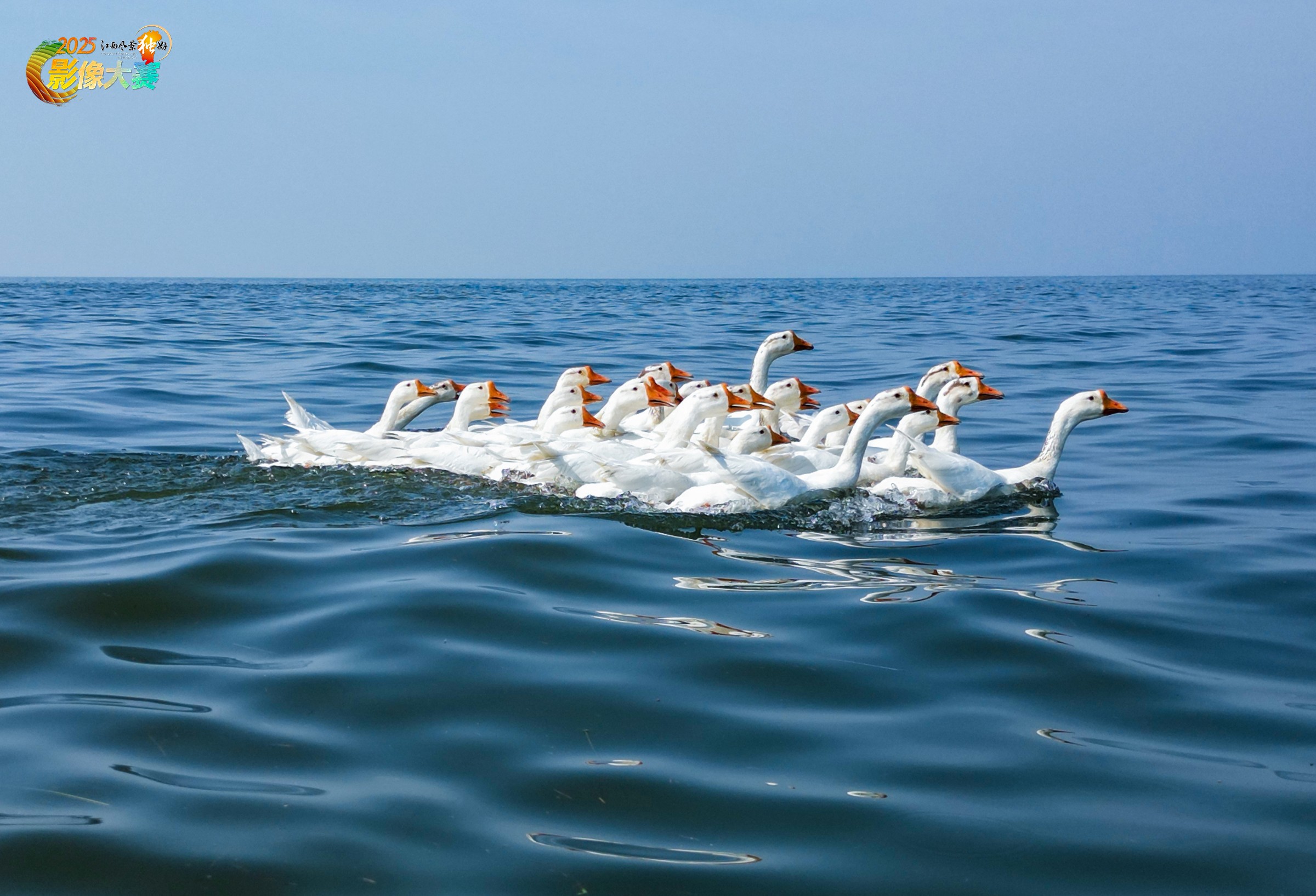 鄱湖天鹅游弋图:群鹅逐浪,碧波映天生态美。这是在鄱阳湖水面上成群游弋的白鹅景象。它们全身洁白,颈部修长,喙部呈橙红色,体型较大,羽毛在阳光下显得光滑有光泽。鹅群排列紧密,整齐划一地向前划行,水面因它们的划动而泛起细小的涟漪,姿态从容而有序,体现出群体活动的和谐与力量。
