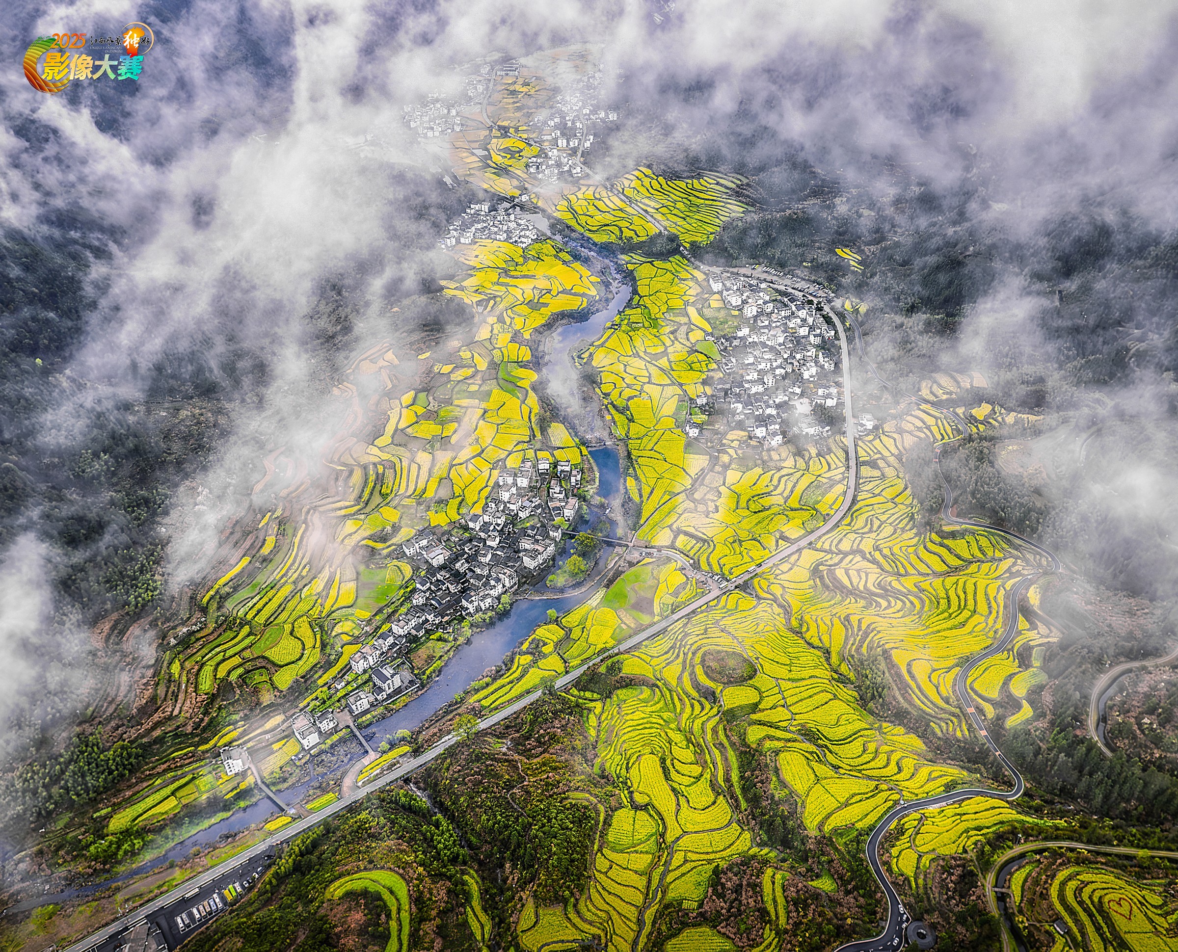 2023年3月25日,航拍于婺源县江岭景区。云雾缭绕在山间,油菜花田呈现出金黄色的梯田景观,河流蜿蜒穿过村庄,与周围的青山绿树相映趣。