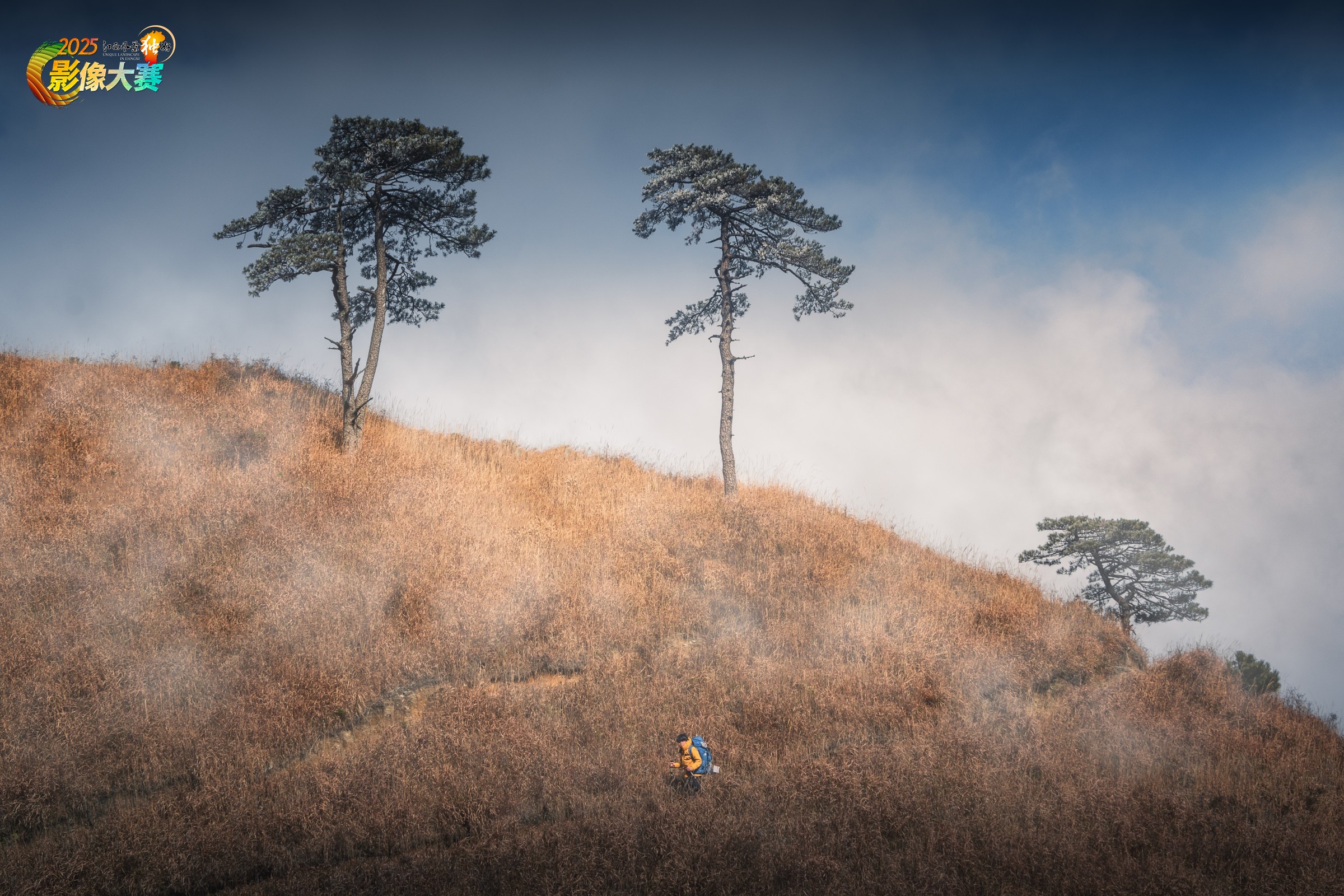 当时正是下山的路上,回头望去,看到一位和我一样的攀登者,背着包,于是等到他走到中间的时候便拍下了这张《云海草甸孤旅:武功山松伴行者》