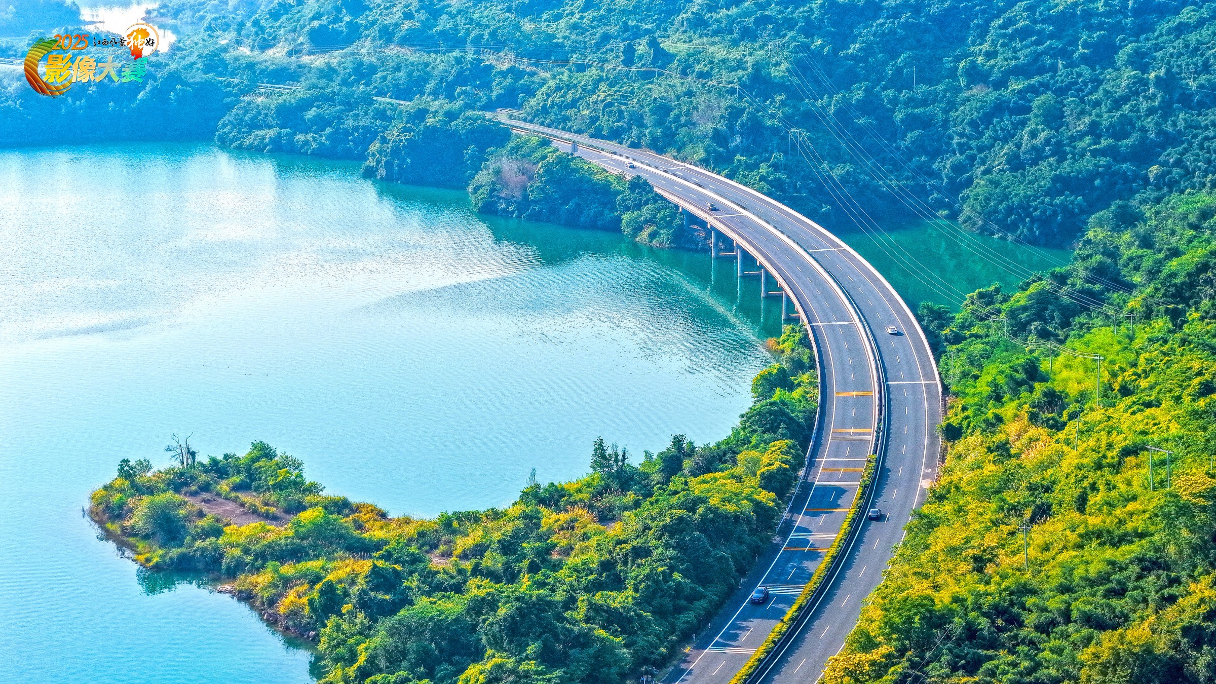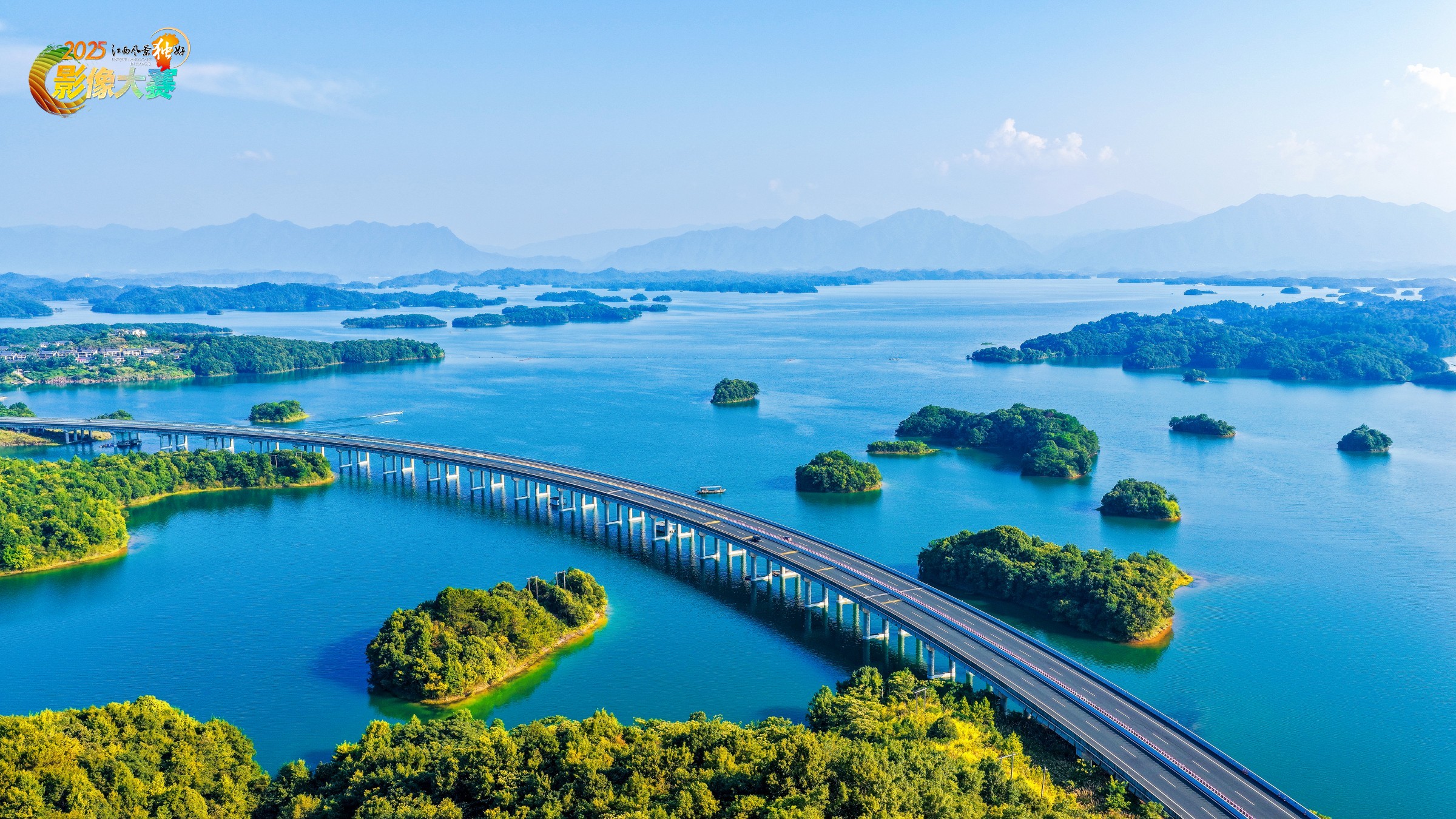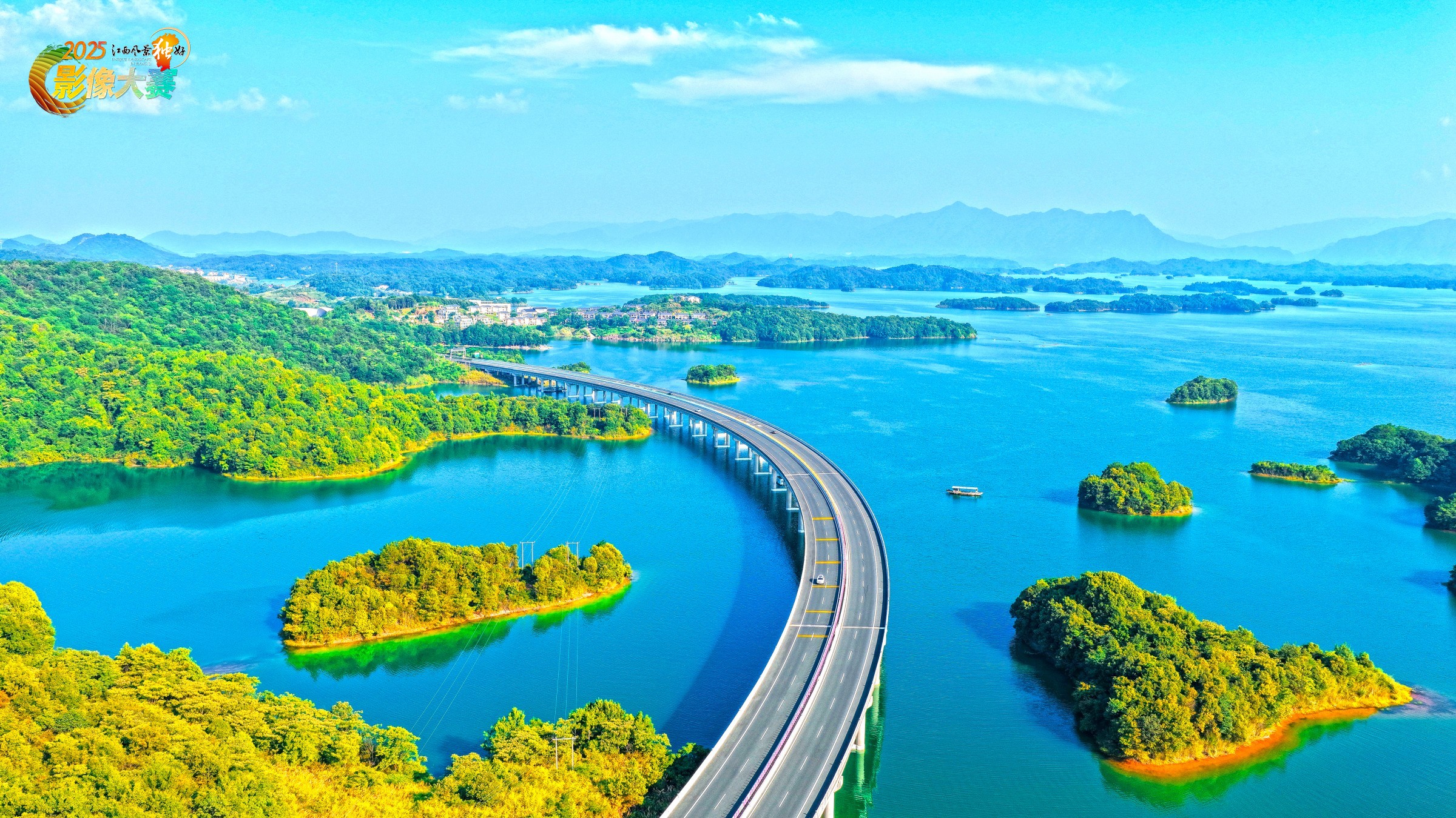 作品生动展现了交通基础设施与自然风光的和谐共存。蜿蜒的高架桥如巨龙般盘旋在碧绿的湖面上,车辆在桥上畅通无阻,展现了现代交通的便捷与高效。湖水清澈见底,岛屿点缀其间,四周群山环抱,绿意盎然,构成了一幅动人的山水画卷。这组照片不仅体现了工程技术的壮丽,更彰显了自然生态的美丽,让人在感受交通发展的同时,也领略到大自然的无限魅力。