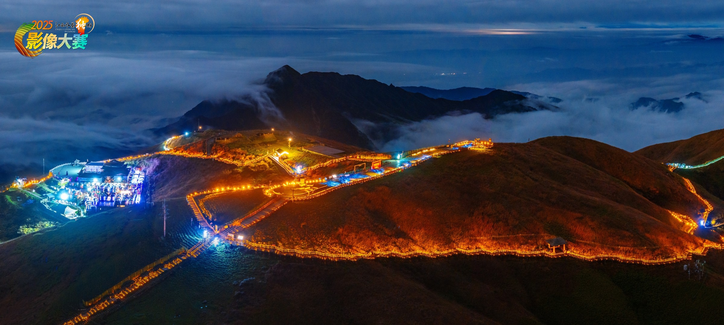 夜幕下的武功山,云海在山巅流转,金顶游步道灯火如星点散落,在暗夜中勾勒出山间轮廓,与漫天夜色相映成趣。2025年11月4日拍摄。