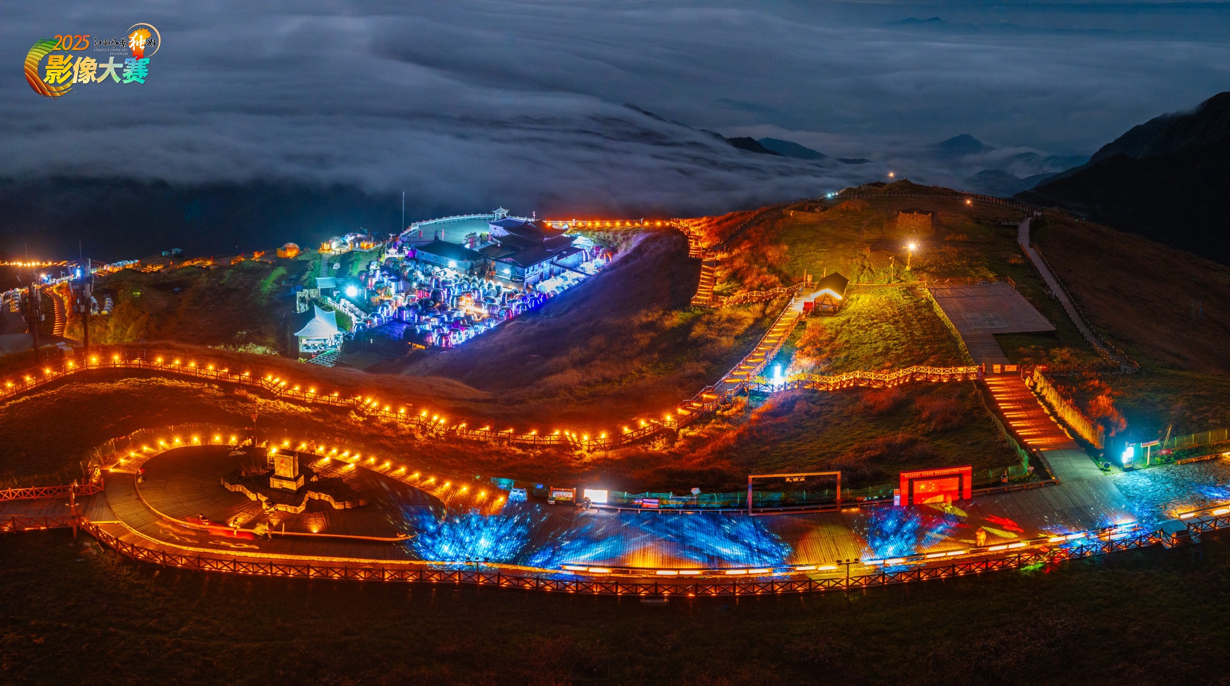 画面中,武功山金顶灯火错落交织,如星河倾泻,在暗夜中铺展成璀璨灯海;云海氤氲流转,将灯光晕染成柔和光晕,使硬朗的山巅轮廓多了几分朦胧诗意。