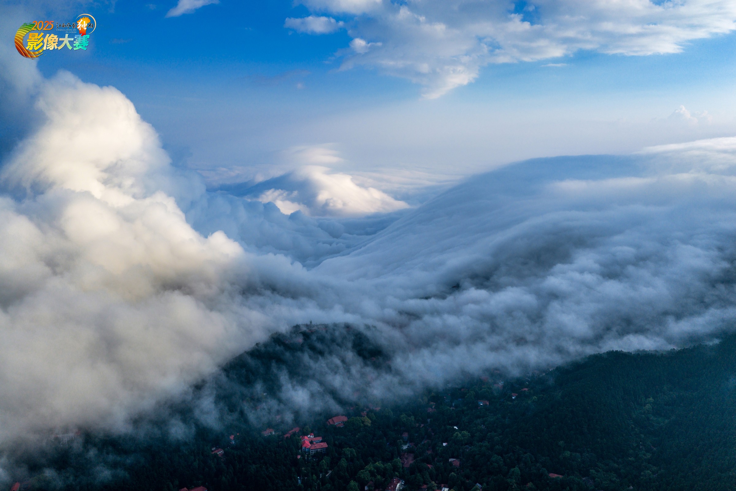 图片拍摄于2025年9月18日,拍摄地:江西庐山。这是一幅航拍的庐山云海景观图,云海如汹涌的白色浪潮在山峦间翻涌、弥漫,部分红顶建筑与翠绿山林在云雾中若隐若现。澄澈的蓝天与厚重的云海形成鲜明对比,整体画面传递出空灵、静谧且壮阔的氛围,尽显大自然的雄浑与神秘,宛如一处被云海环抱的人间秘境。