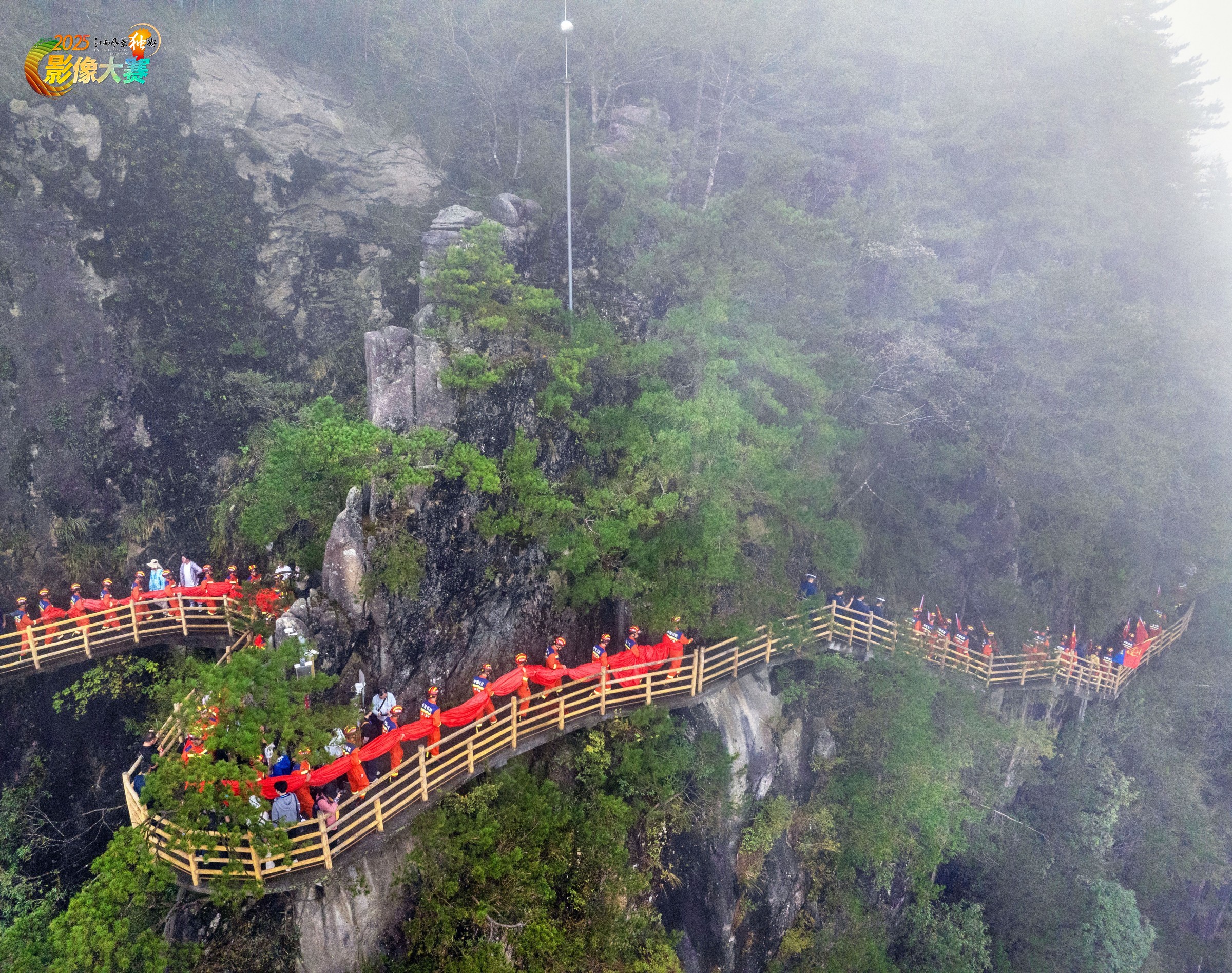 “火焰蓝遇见中国红”宜春明月山景区与消防迎国庆高山栈道展护国旗活动。