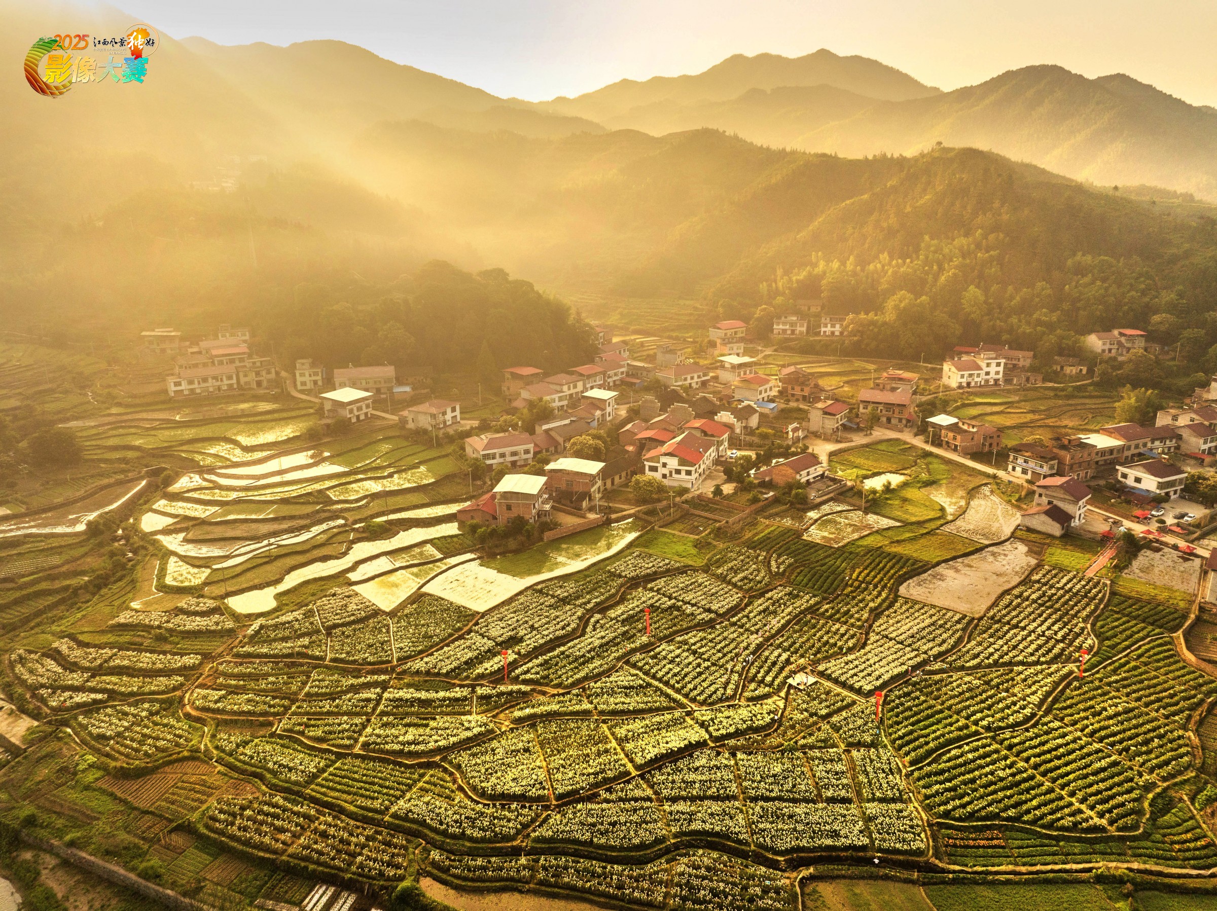 江西省万载县白水乡永新村百合花种植园乡村旅游地在晨曦中与小山村相映成趣。