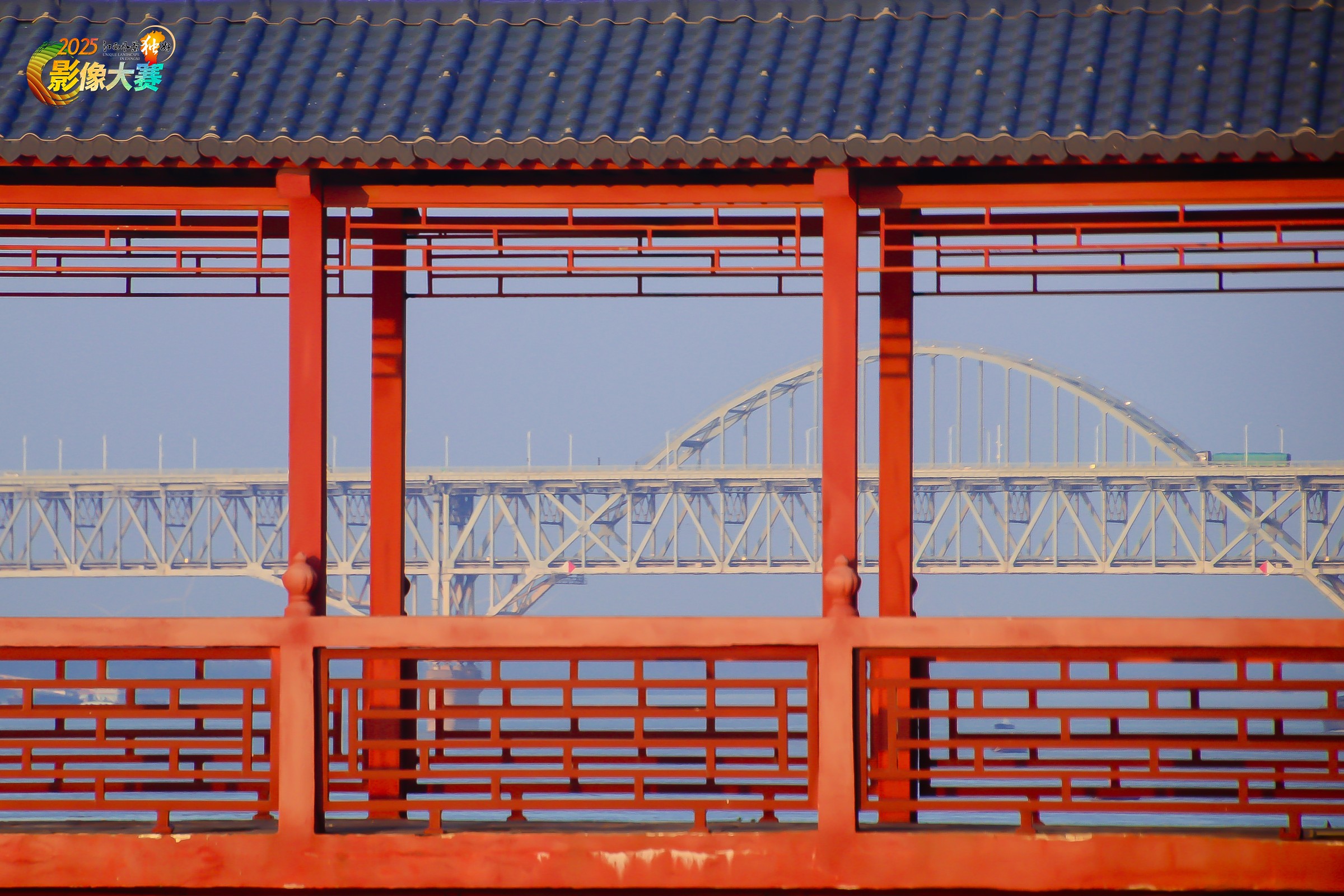 九江长江大桥与仿古廊桥的古今对比,长江大桥与古代廊桥交相辉映。