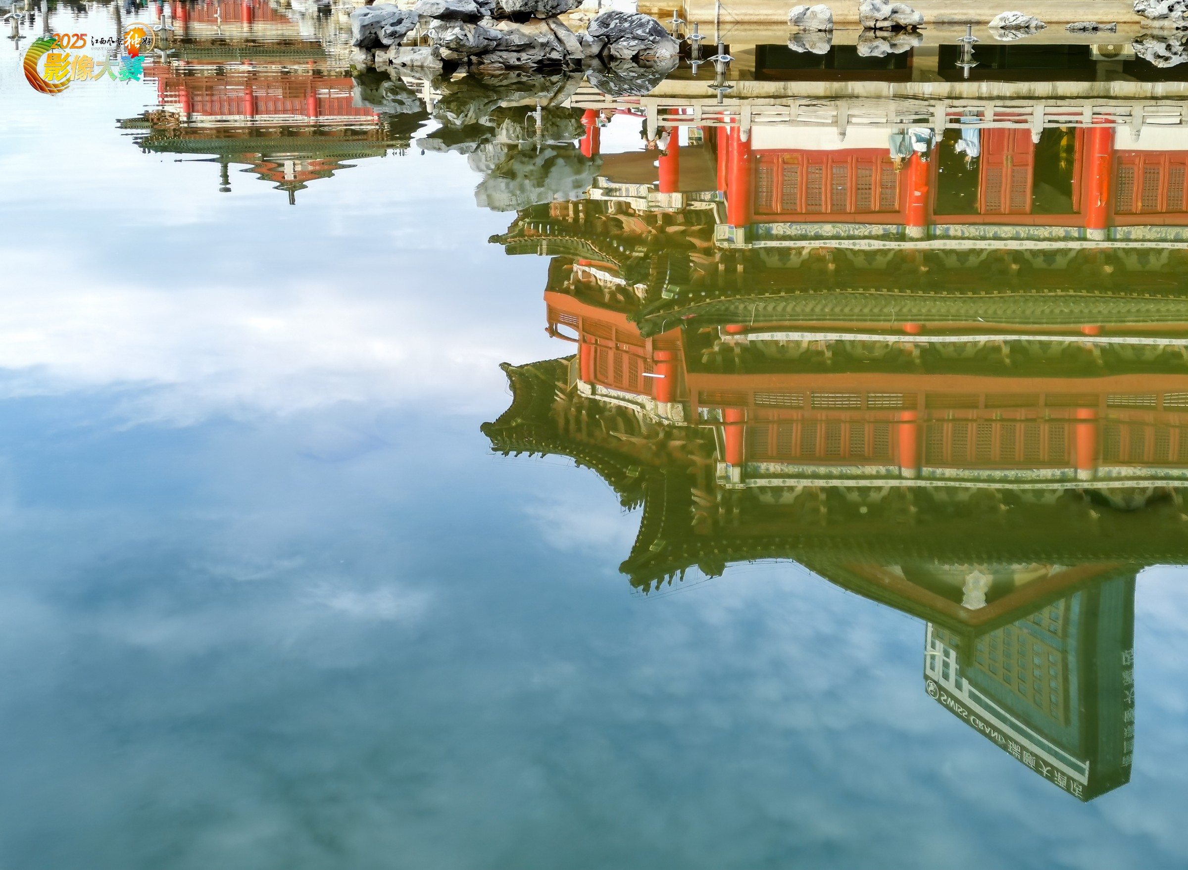 滕王阁建筑的水中倒影。