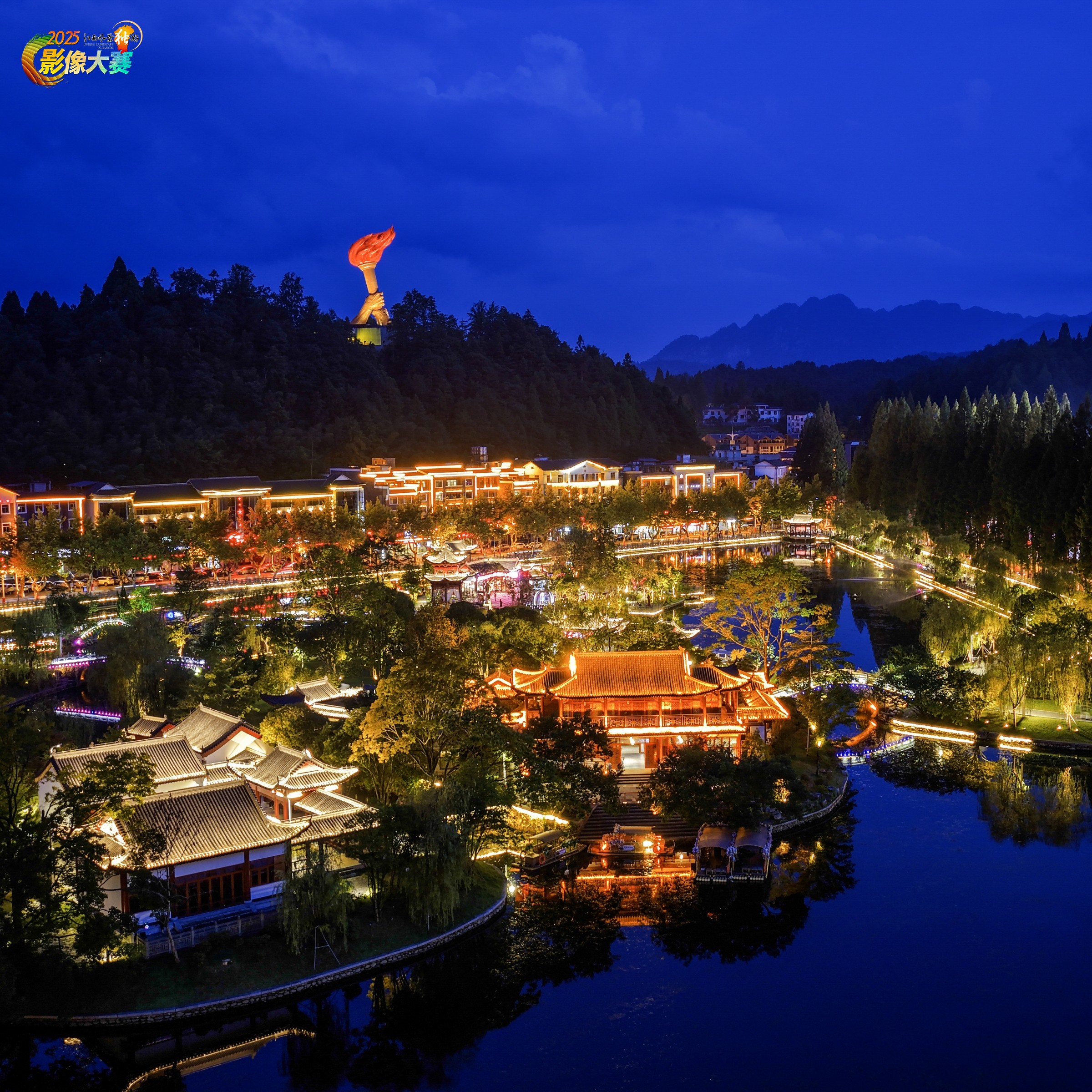 今日井冈山市茨坪镇华灯初上,挹翠湖畔,灯光璀璨,呈现井冈山景区繁荣景象。