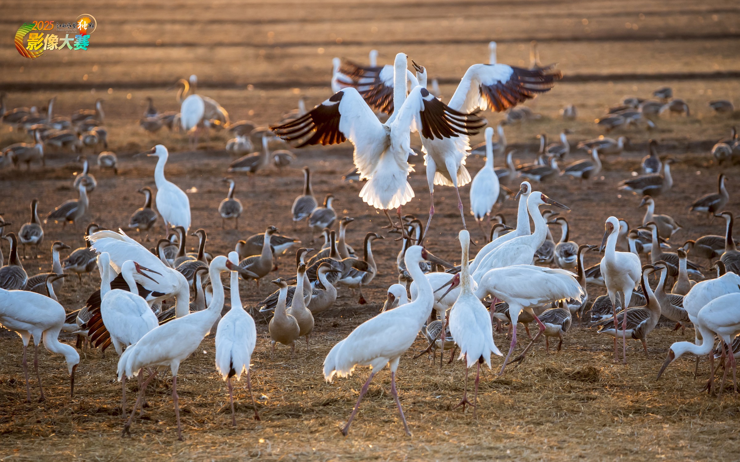 江西鄱阳湖平原,大雁、白鹤等候鸟冬季的家园、快乐的家园。拍摄与江西余干县插旗洲等地。拍摄时间2025年2月。原创作品。