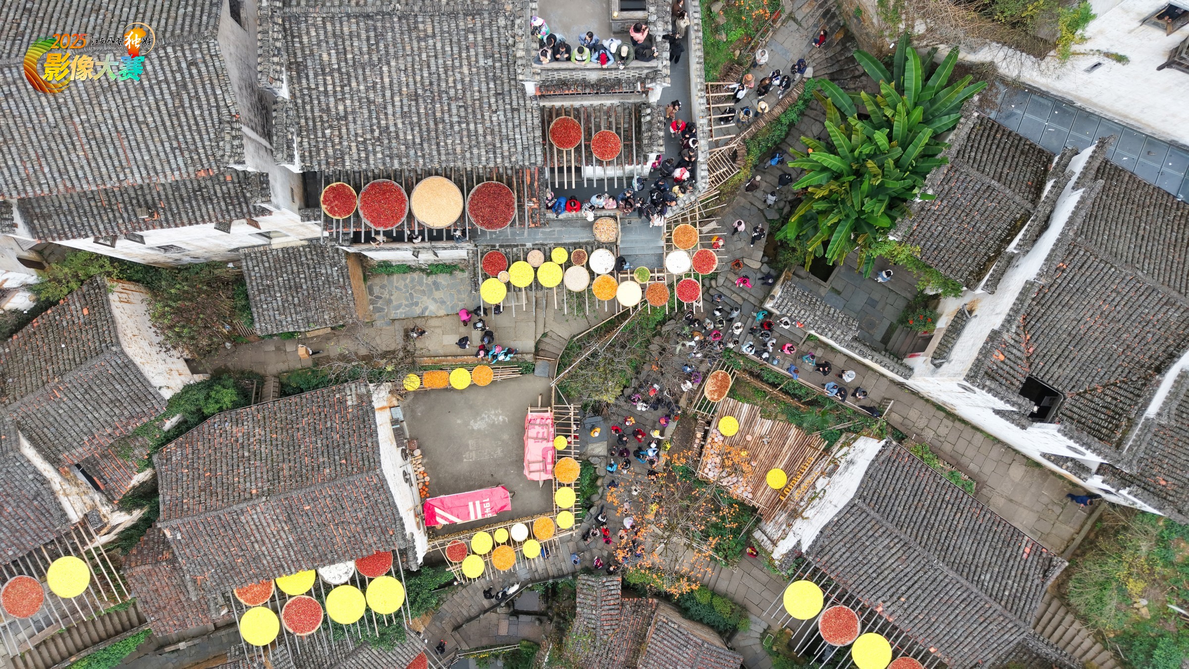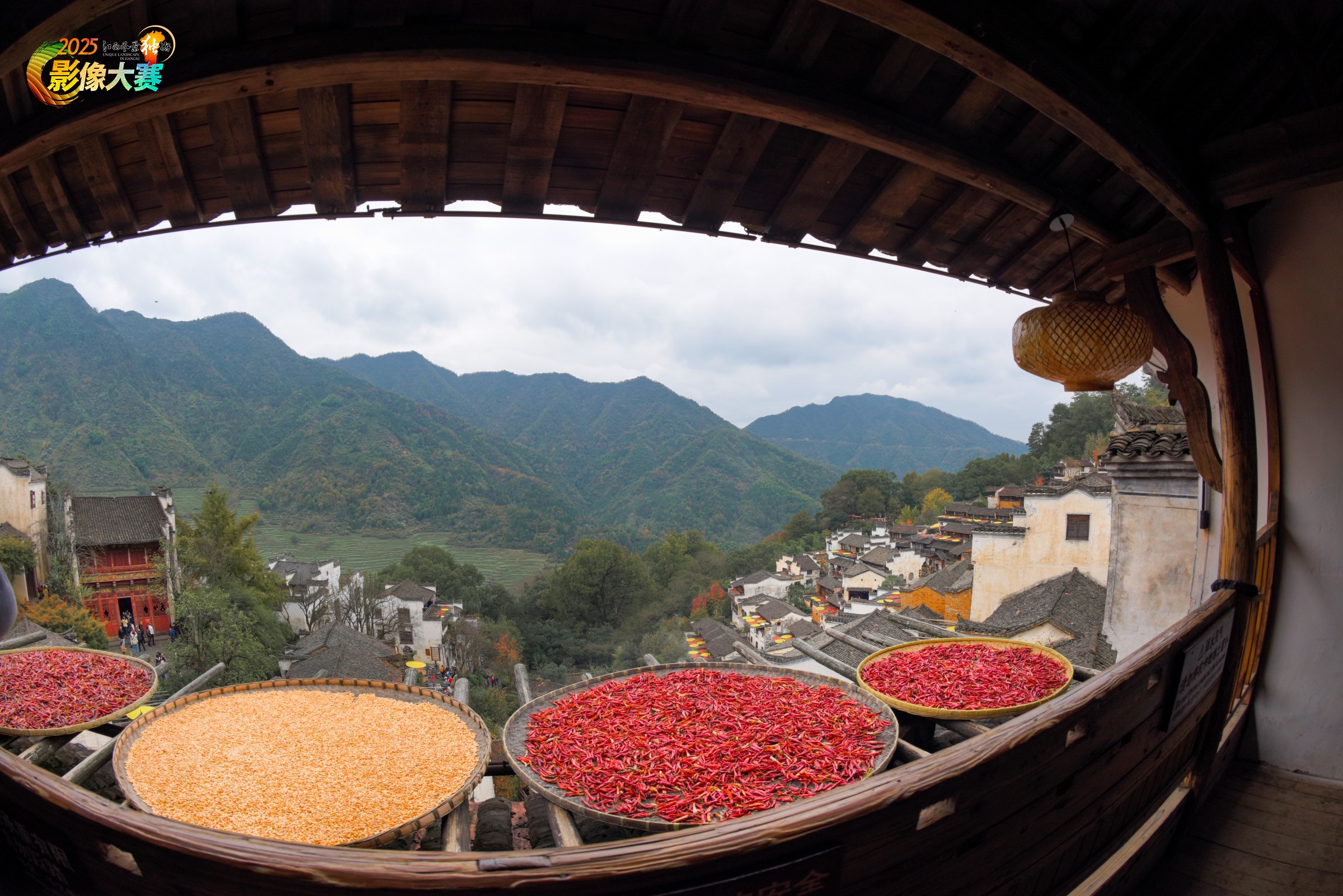 俯看篁岭晒秋,家家户户窗口都晒出的暖色的辣椒玉米。