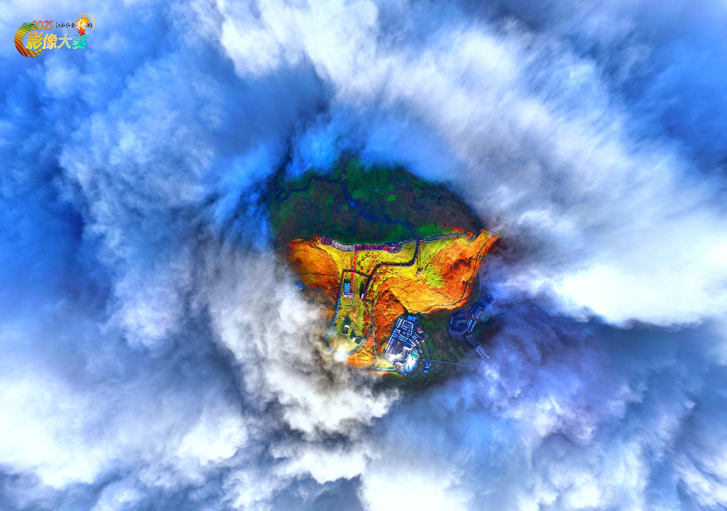 这幅作品以奇幻视角定格武功山金顶:云海如翻涌的蓝白浪潮,将金顶裹作浮于云间的“彩屿”——橙黄草甸、青绿坡地与建筑相映,像是天地间遗落的斑斓珍宝,既藏着高山的壮阔,又晕染出童话般的梦幻感。