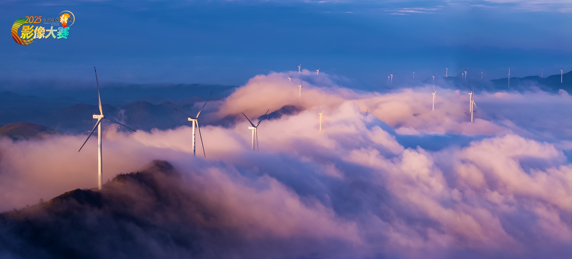 云海如涛漫卷山峦,风车群在粉紫雾霭间舒展扇叶,把风的律动凝成流动的电能——自然的壮阔与工业的轻盈在此相融,是云涌风动里的能量诗行。