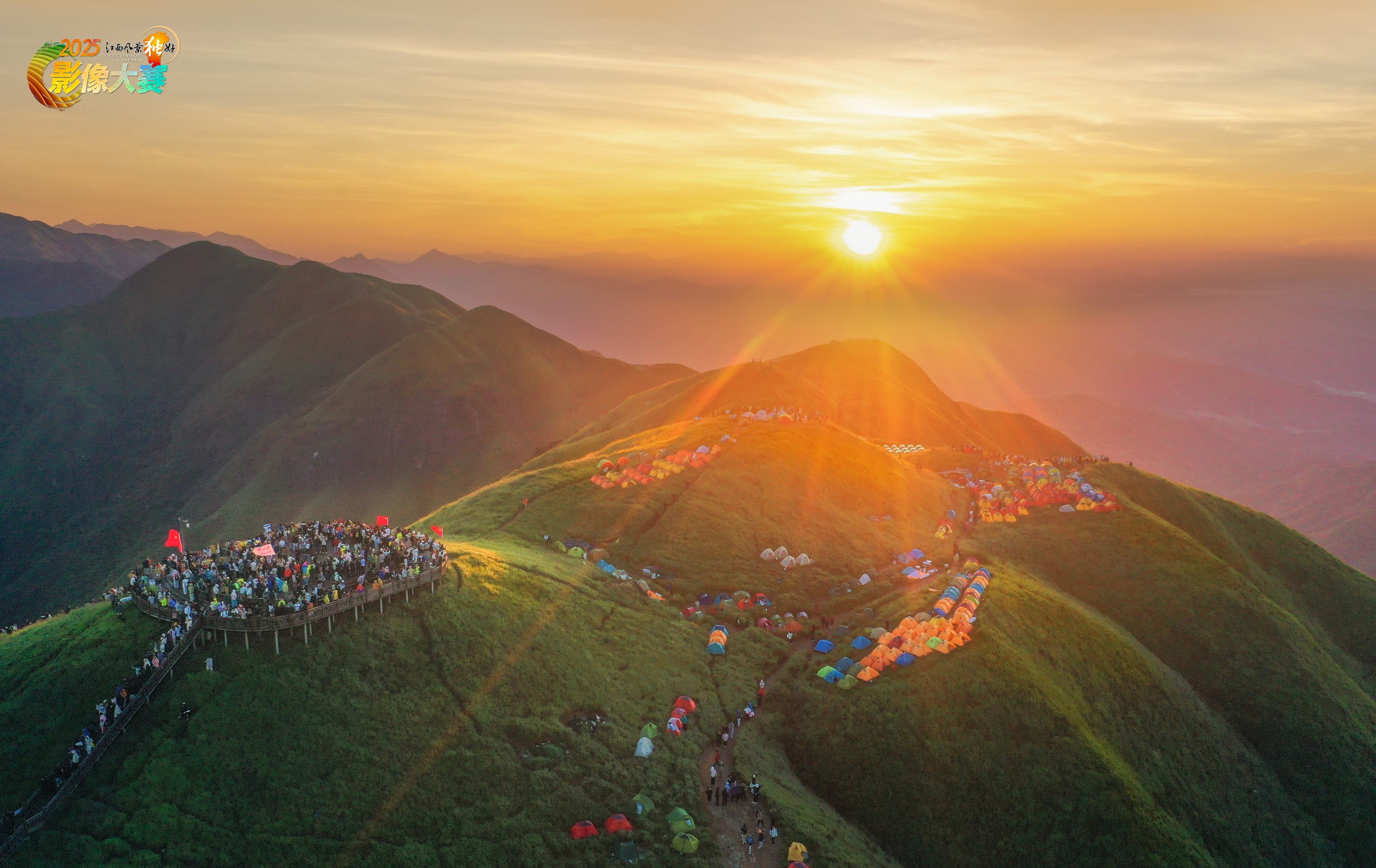 武功山云顶景区,日出鎏金,彩色帐篷与观日人群,在草甸间谱就自然狂欢曲。