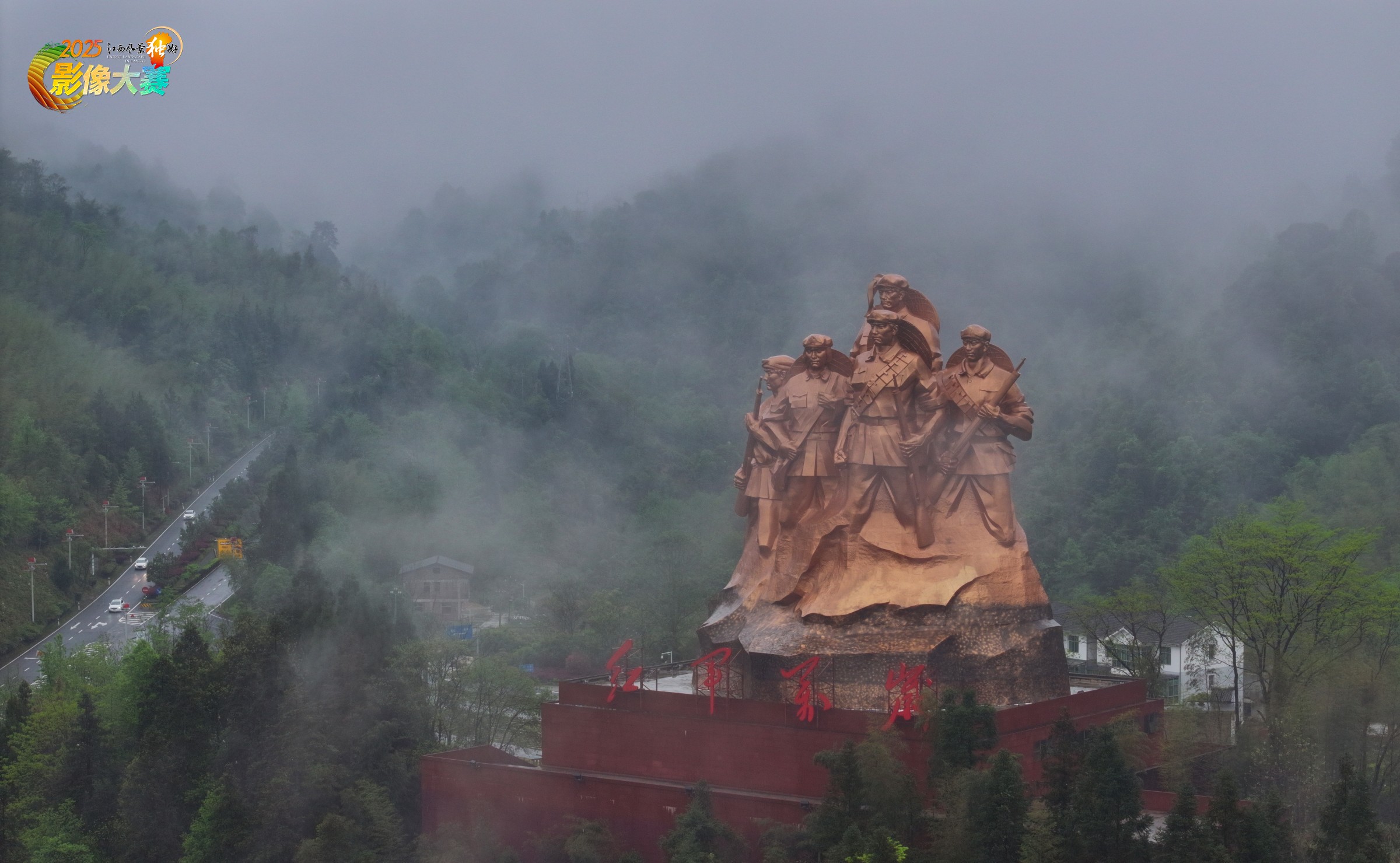 在云雾轻笼的青山怀抱中,一组红色英雄群雕如丰碑般定格着热血往昔,将革命精神的深沉传承与新时代的发展通途紧紧交织。