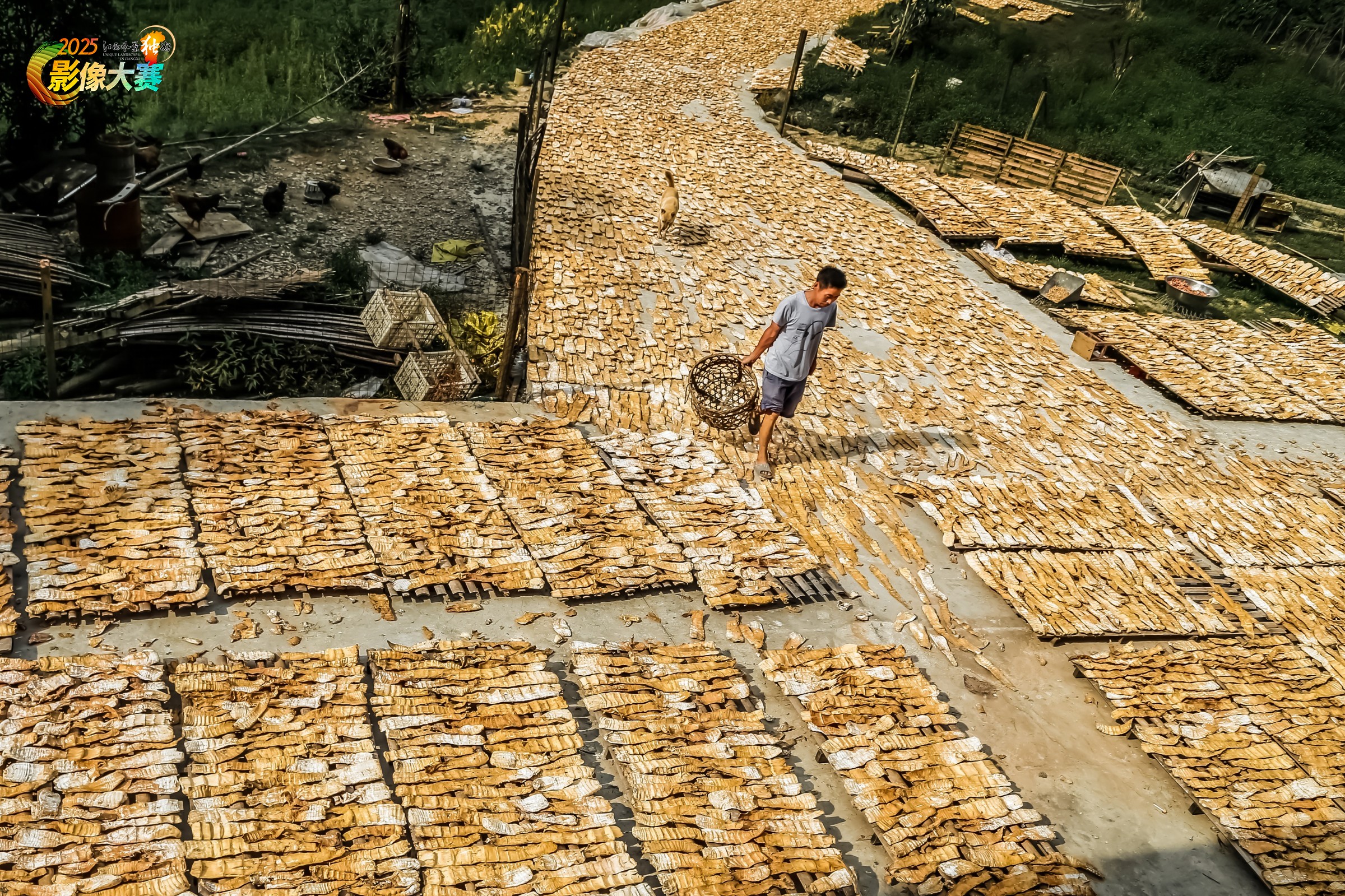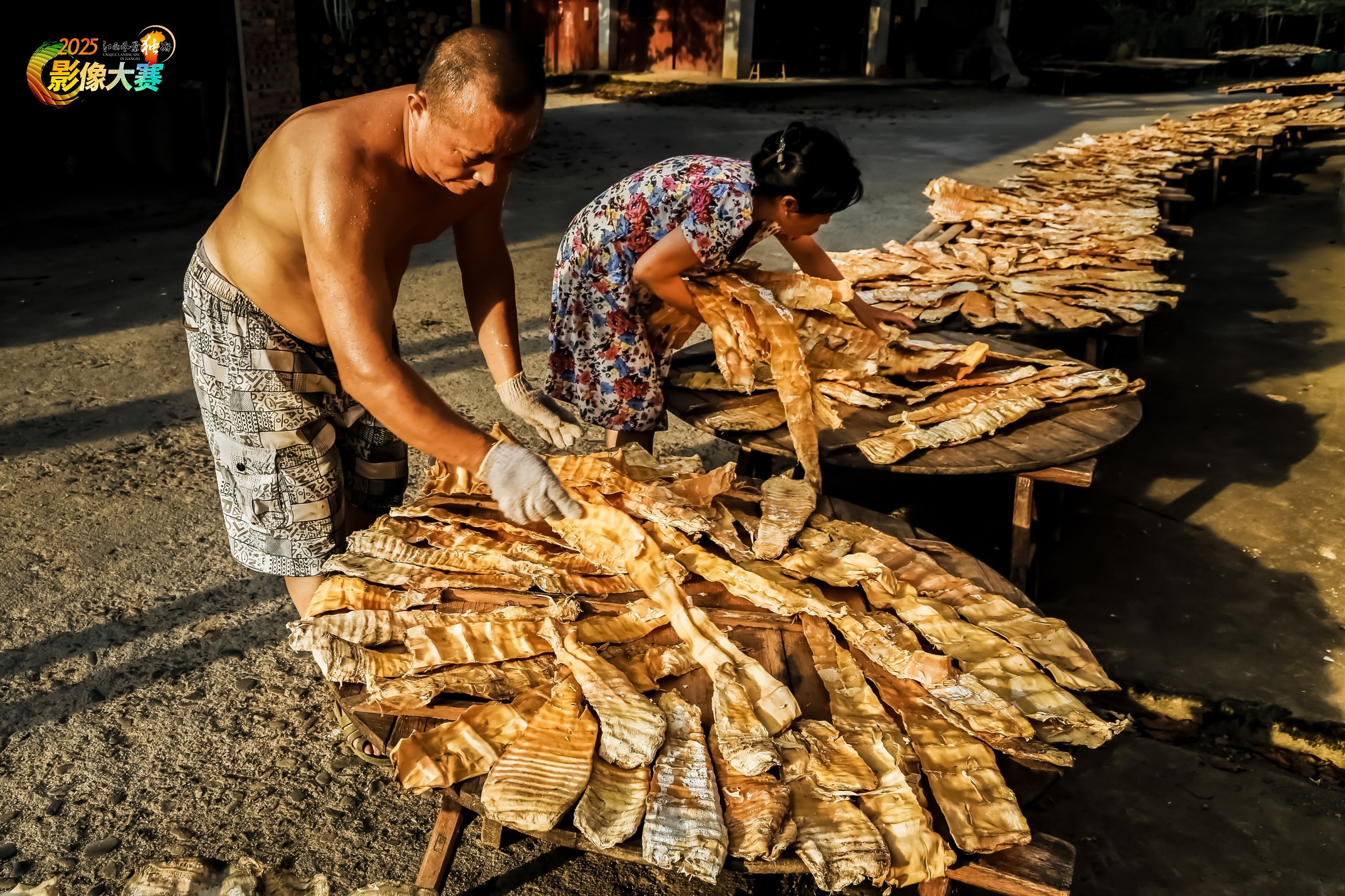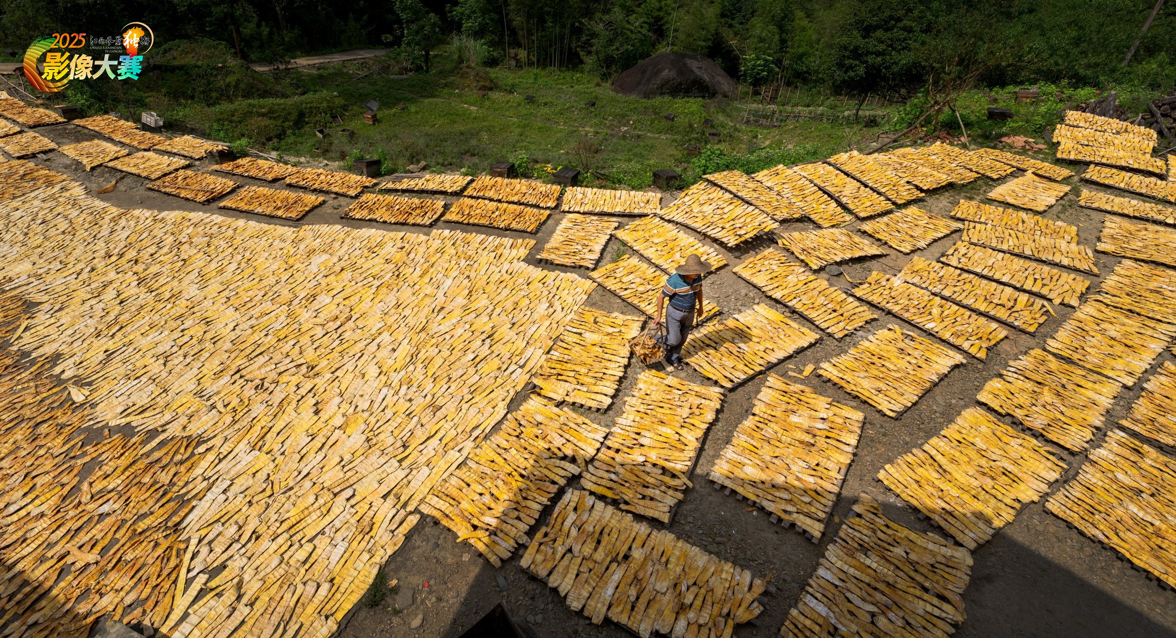铜鼓县大塅镇双红村,依托4万多亩毛竹林,不仅培育出12家竹笋加工企业,更通过竹林培育改造项目资金补助,实施毛竹林高标准改造,带动150余名村民参与竹林抚育、采伐等务工,让林农在竹林改造中既获得政策红利,又实现家门口就业,这是村民采收竹笋压榨后进行晾晒。