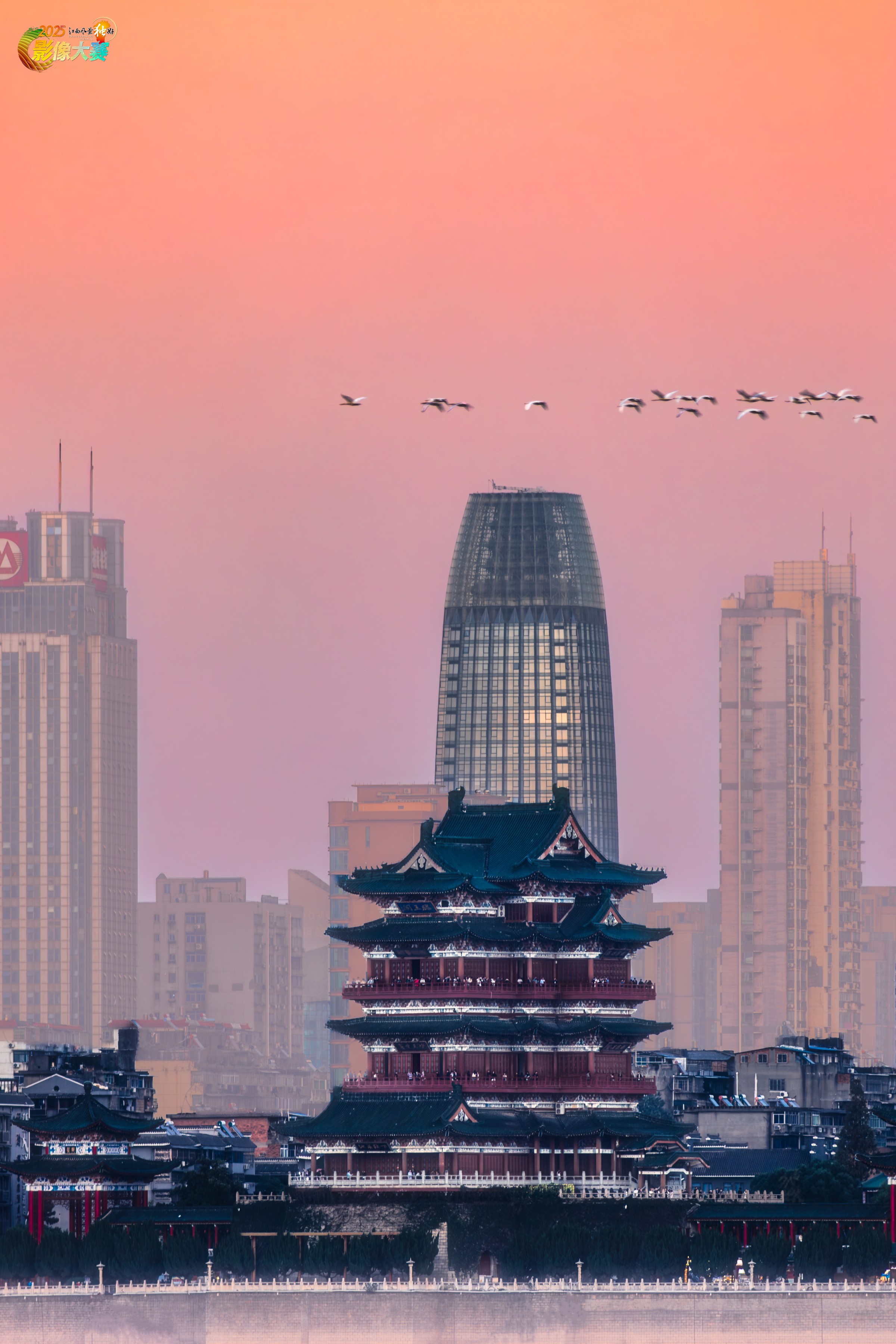画面中,滕王阁以其古雅的多层楼阁建筑形态居于视觉中心,飞檐翘角、红墙黛瓦,尽显中国古典建筑的精巧与庄重,楼阁上还能看到不少游客,增添了灵动气息。 背景是现代化的城市建筑群,其中的投资大厦上还有一座小滕王阁,古今建筑风格的碰撞,勾勒出南昌的城市发展脉络。天空被粉橙色的晚霞晕染,一群飞鸟翱翔其间,为画面增添了动态美感,整体氛围既古朴典雅又充满都市活力,将历史人文与现代都市风光完美融合。