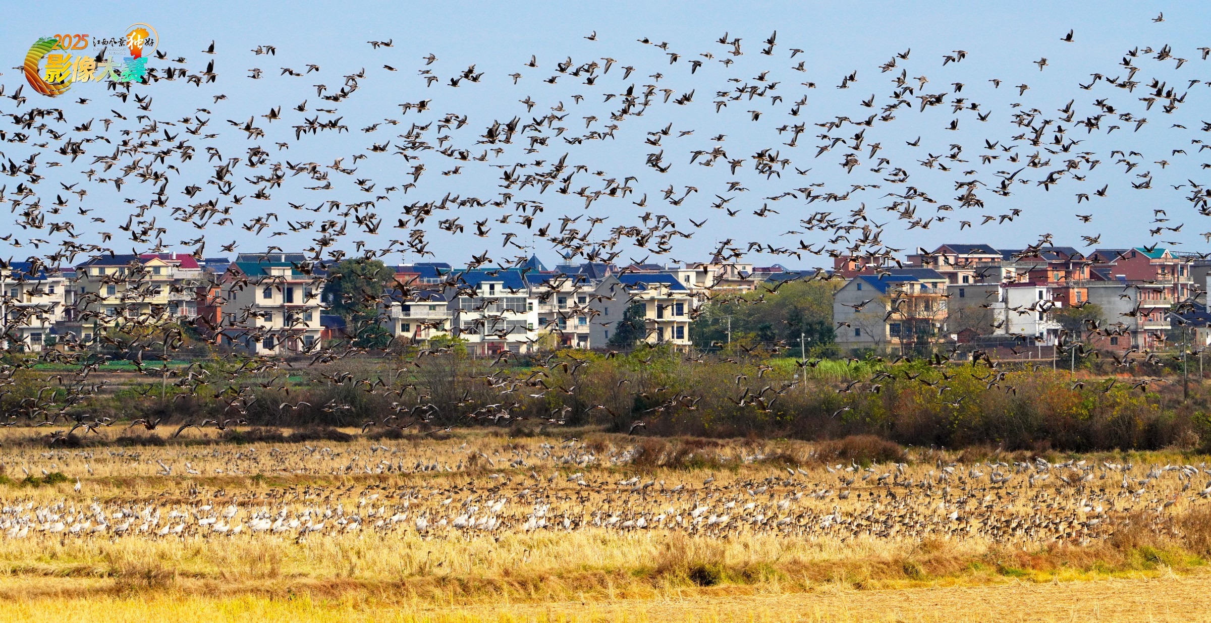 《鄱湖盛宴》图片说明:越冬候鸟从遥远的北方飞至鄱阳湖越冬,鄱阳县政府出台一系列爱鸟护鸟措施,保护候鸟。图为成数以万计的大雁、灰鹤聚集鄱阳聂家500亩未收割的稻田——候鸟食堂聚餐。