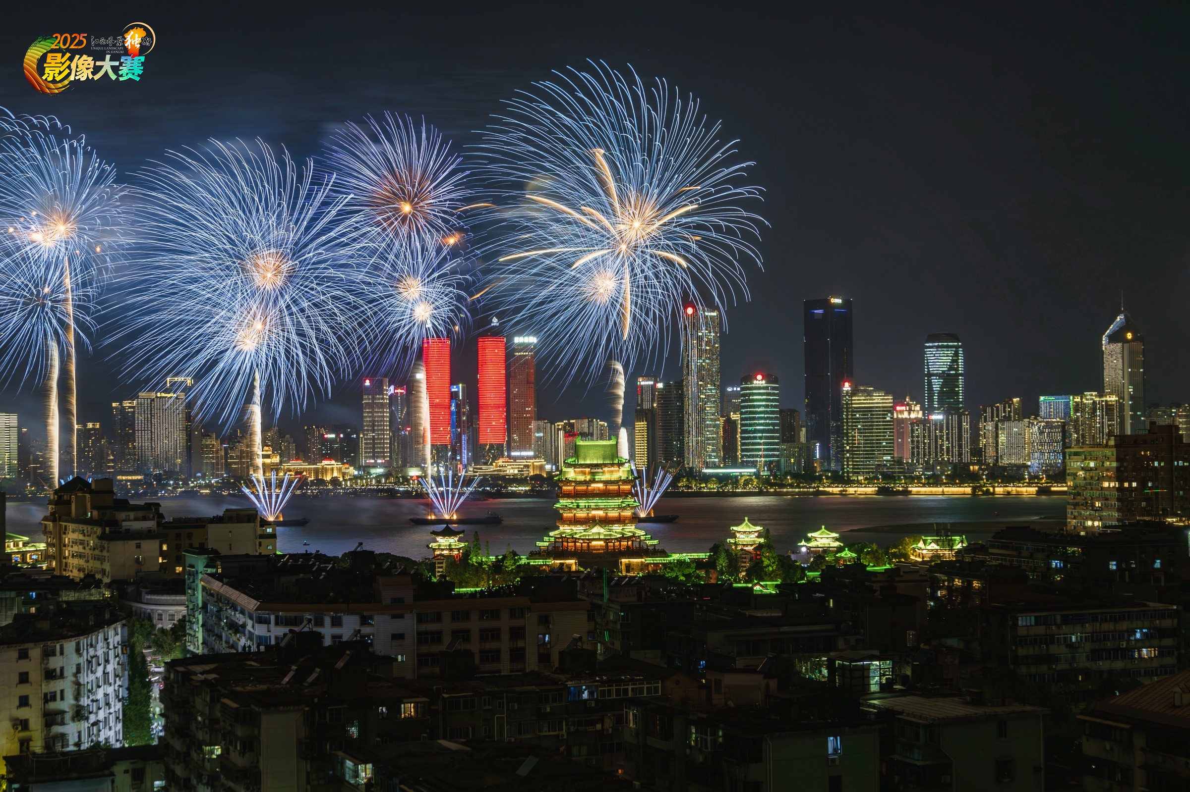 今夜赣江两岸,是古楼接住了烟花, 老城的窗灯碰着新城的霓虹—— 这是南昌,把千年前的“落霞”, 揉进了此刻的烟火里。