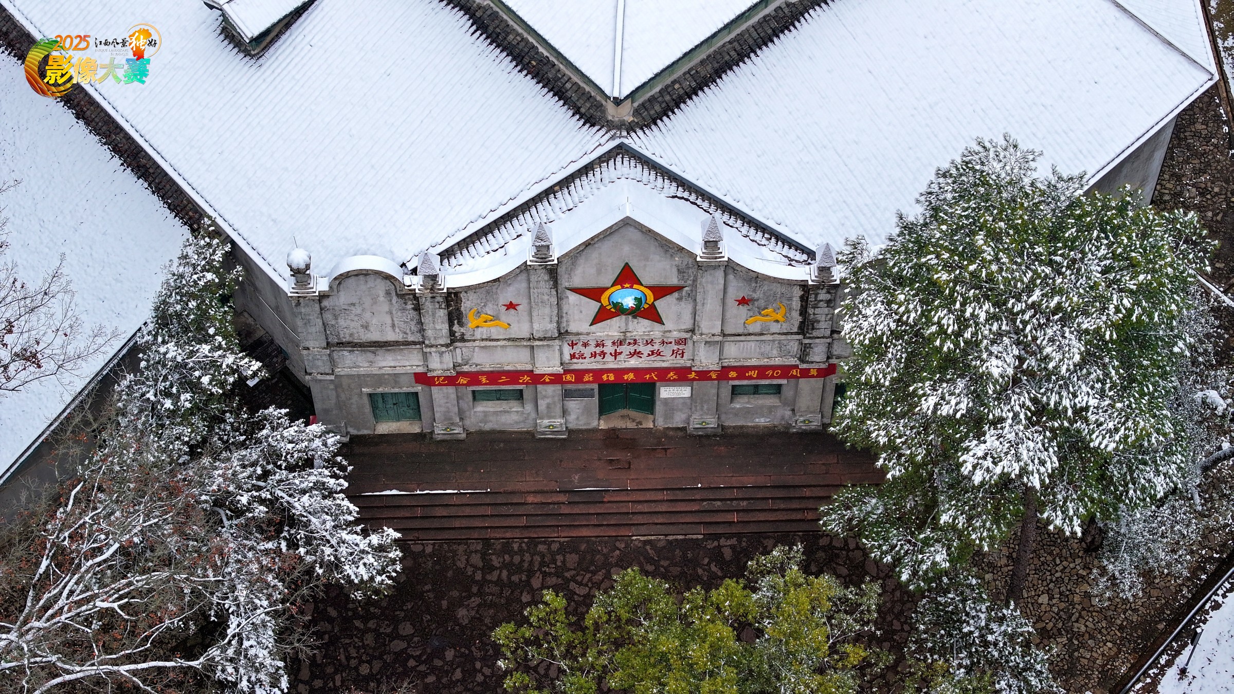 雪后瑞金沙洲坝大礼堂的空中视角