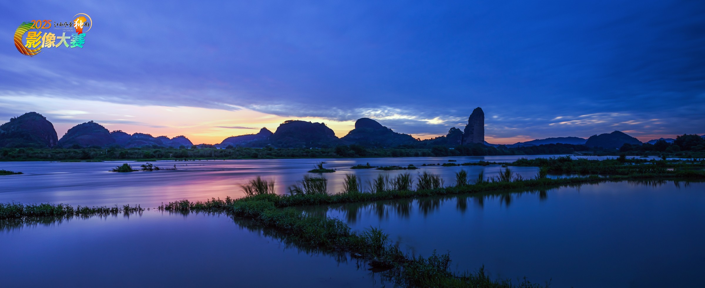 画面中,河流如镜,倒映着天空的蓝紫与橙黄渐变的晚霞,岸边水草点缀其间。远处的丹霞地貌山峰轮廓分明,其中标志性的“金枪峰”挺拔矗立,在清晨一线阳光的映射下更显奇特。整体氛围静谧悠远,将龙虎山的山水灵韵与黄昏的诗意融合,尽显丹霞山水的独特壮美。 2024年5月29日拍摄于江西省鹰潭市龙虎山景区