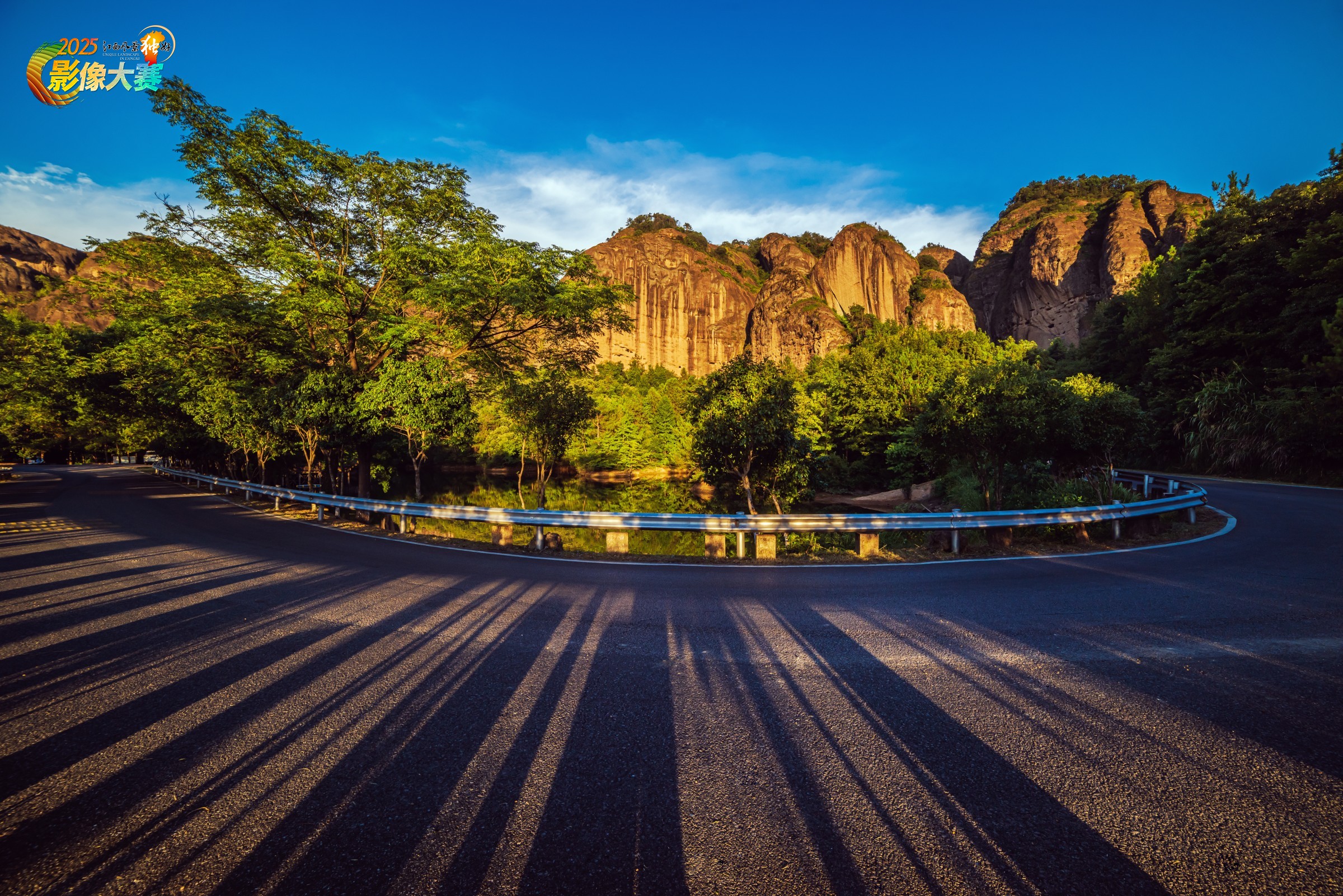 一条沥青公路蜿蜒曲折,公路上树木的影子在阳光照射下形成富有韵律的线条。公路旁的护栏保障着通行安全,周围绿树成荫,郁郁葱葱。远处是造型奇特的丹霞地貌山峰,岩石纹理清晰,在蓝天的映衬下,呈现出雄浑壮丽的质感。整体画面在光影的作用下,既有公路的现代感,又有山林峰峦的自然野趣,营造出一种刚柔并济的视觉效果,仿佛是一处适合自驾游览、欣赏丹霞风光的胜地。 2024年7月19日拍摄于江西省鹰潭市龙虎山景区