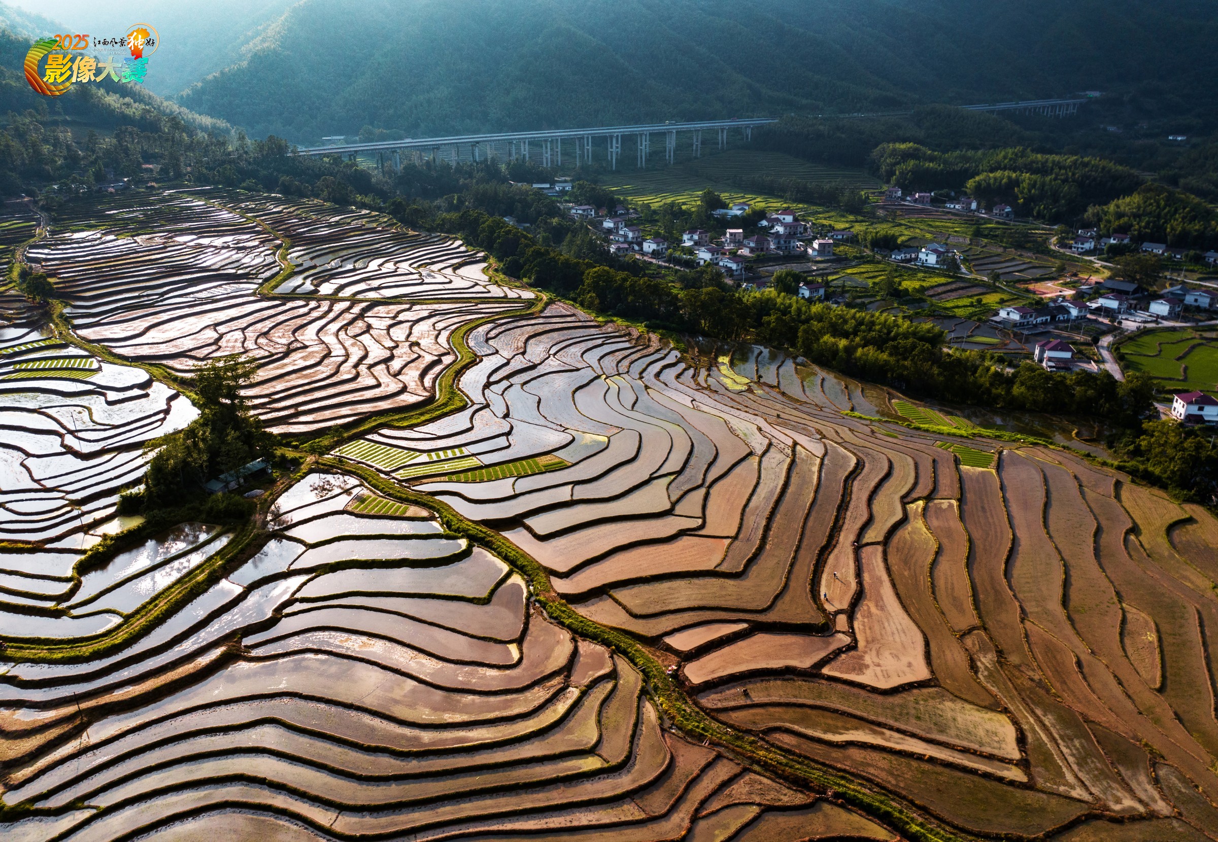 层叠错落的梯田如大地镌刻的波纹,在光线映照下呈现明暗交织的质感,山腰处一座桥梁横跨,为田园景致融入现代气息。 拍摄地址:江西宜春宜丰县